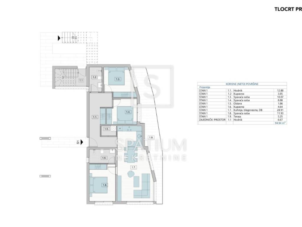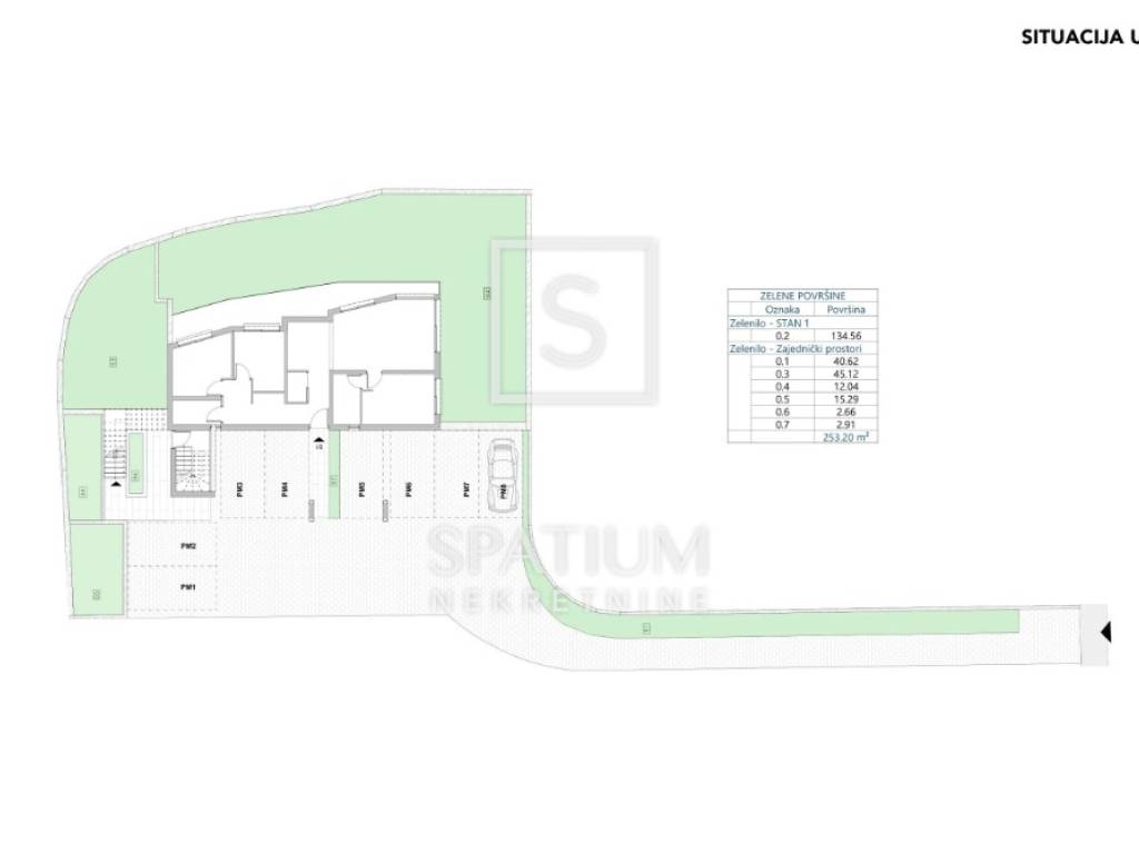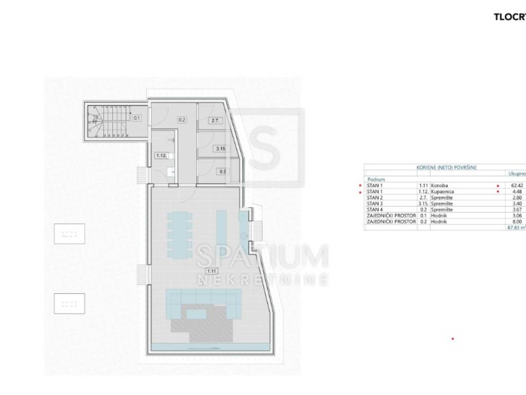 Apartman ima neto korisnu površinu od 94,94 m2. Pripada mu također veliki podrum površine 66,7 m2 s vlastitom kupaonicom koji se može urediti po želji kupca (konoba, soba za zabavu, sauna, fitness itd.) Pripadaju mu i dva parkirna mjesta.