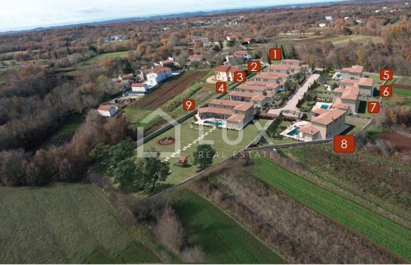 U ponudi imamo kompleks mediteranskih vila sa bazenima. Nalaze se u mirnom mjestu nedaleko od mjesta Svetvinčenat i neposrednu blizinu Istarskog ipsilona od svega 4 km. Udaljenost od većih gradova kao Pule je 30 km a Rovinja svega 20 km, što stanovnicima pruža blizinu urbanim sredinama i moru ali uz istodobnu mogućnost življenja u miru i tišini šarmantnog sela.