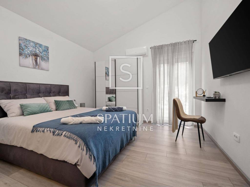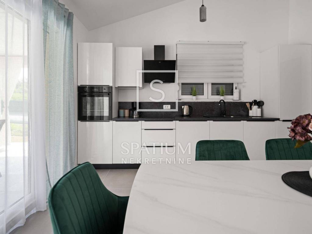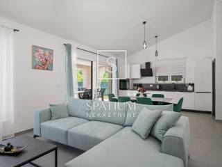 LABIN, u ponudu smo dobili samostojeću kuću u novogradnji s bazenom, u okolici Labina. Smještena je u mirnoj ulici okružena zelenilom, na parceli od 915 m2. Sastoji se od hodnika, spremišta, tri spavaće sobe i tri kupaonice. Iz dnevnog boravka i kuhinje izlazi se na prostranu natkrivenu terasu s bazenom i sunčalištem te osunčanim prostorom za opuštanje i uživanje. Kuća je projektirana kao prizemnica i nudi prostran i funkcionalan tlocrt. Klimatizirana je (split sistem grijanje i hlađenje) te potpuno opremljena svim potrebnim sadržajima i stvarima. Prodaje se kompletno namještena i spremna za useljenje ili odmor. Idealna je i za iznajmljivanje zbog svoje mikrolokacije.