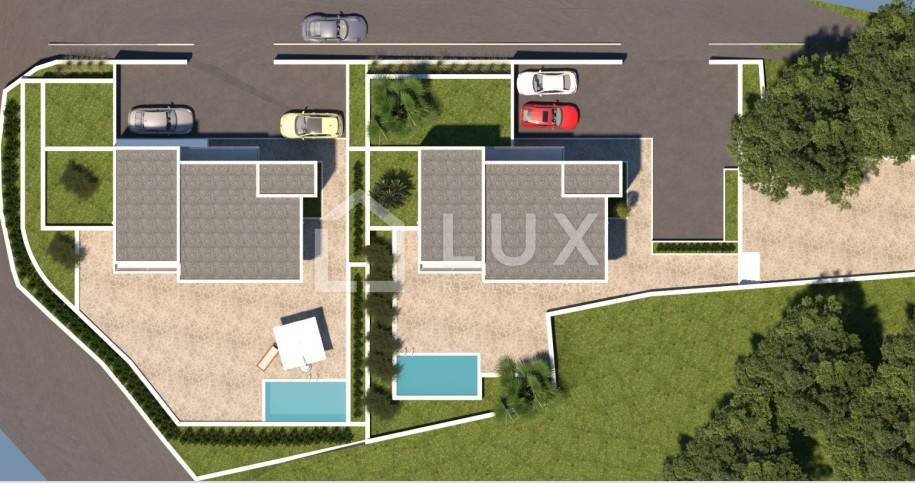 Na katu se nalaze dvije terase, dok je u prizemlju smještena velika natkrivena terasa, spojena sa prostorom za sunčanje i bazenom. Otvoreni pogled na more krasi svaku etažu. Unutar okućnice sa nalaze četiri parkirna mjesta.