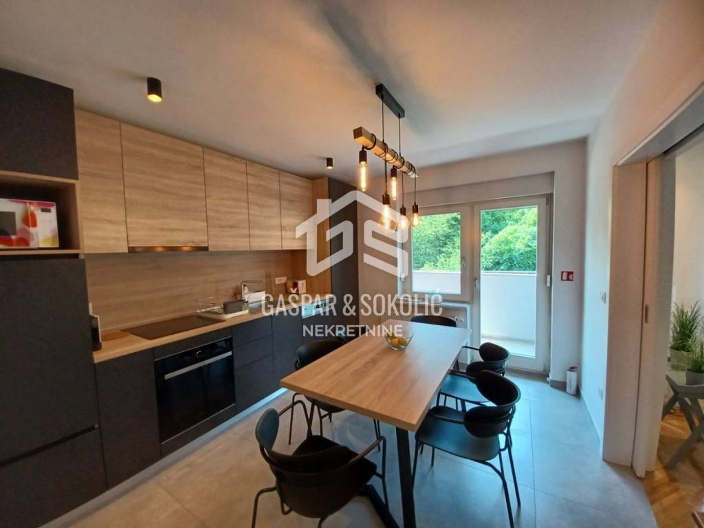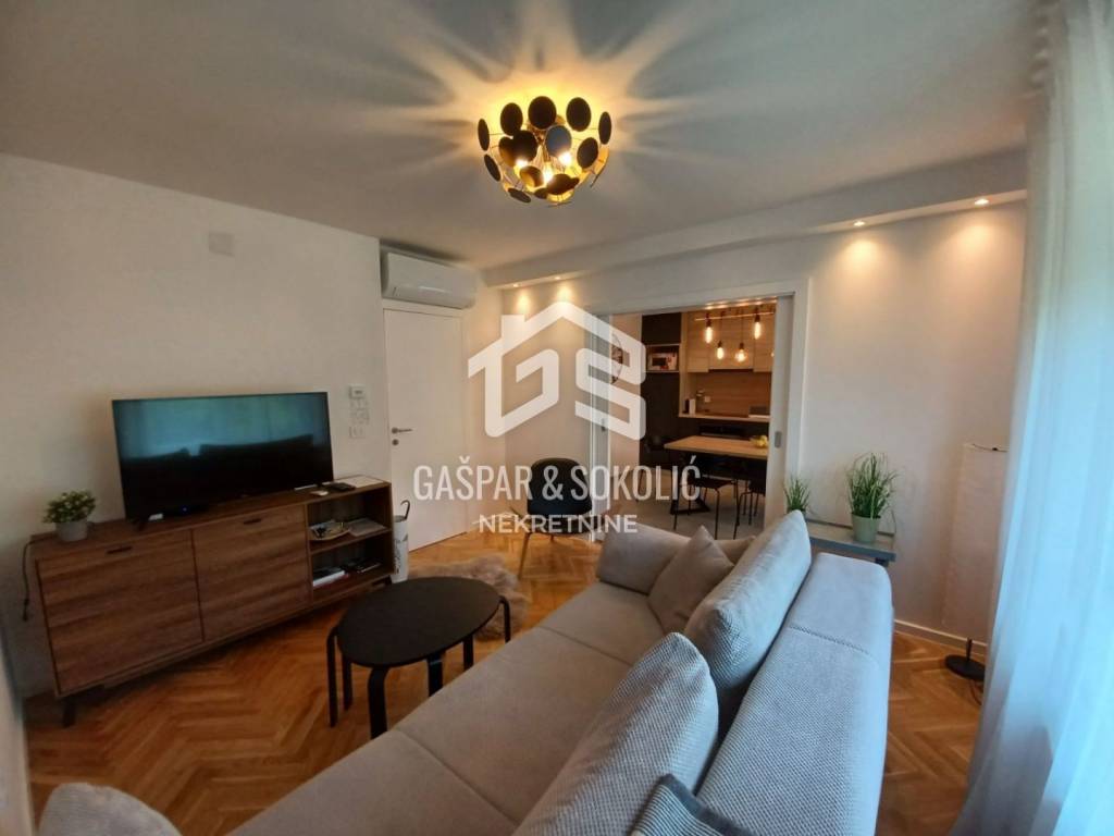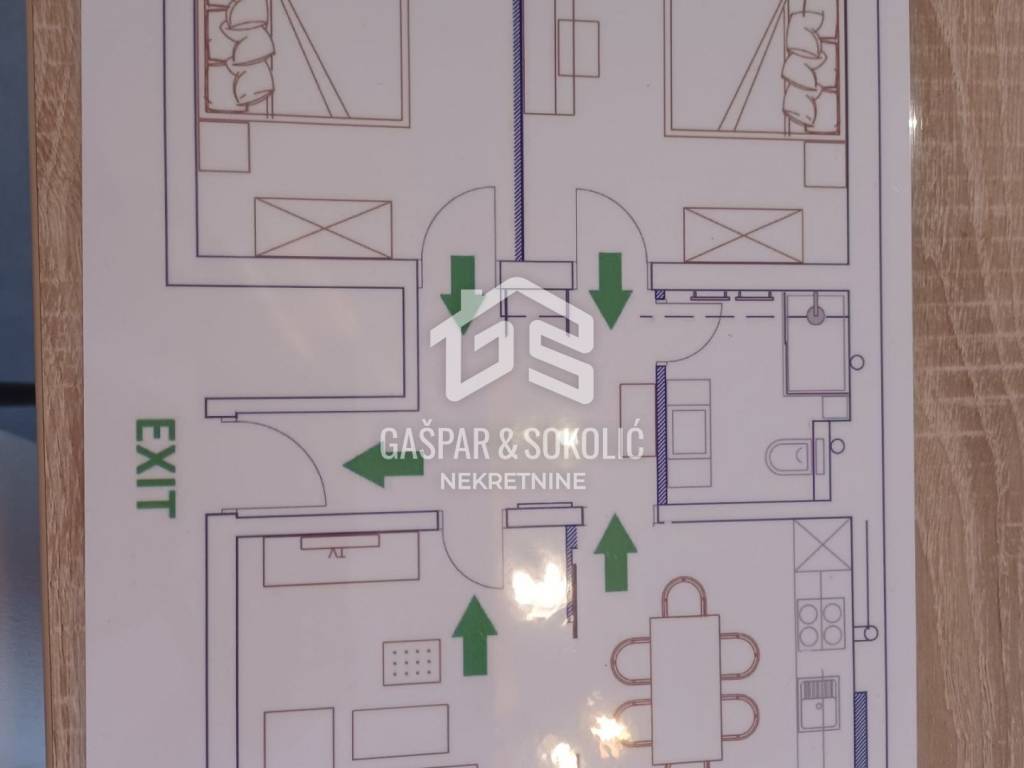 Stan se nalazi na 4 katu zgrade (s liftom) od ukupno 5 katova. Sastoji se od lijepog ulaznog prostora/hodnika, kuhinje sa blagovaonom (iz koje se izlazi na balkon, s kojeg se pruža lijep pogled na zelenilo), dnevnog boravka, koji je moguće zatvoriti kliznim vratima te odvojiti od kuhinje, ali i koristiti kao ˝open space˝. Stan ima dvije prostrane spavaće sobe i kupaonicu sa tuš kabinom.