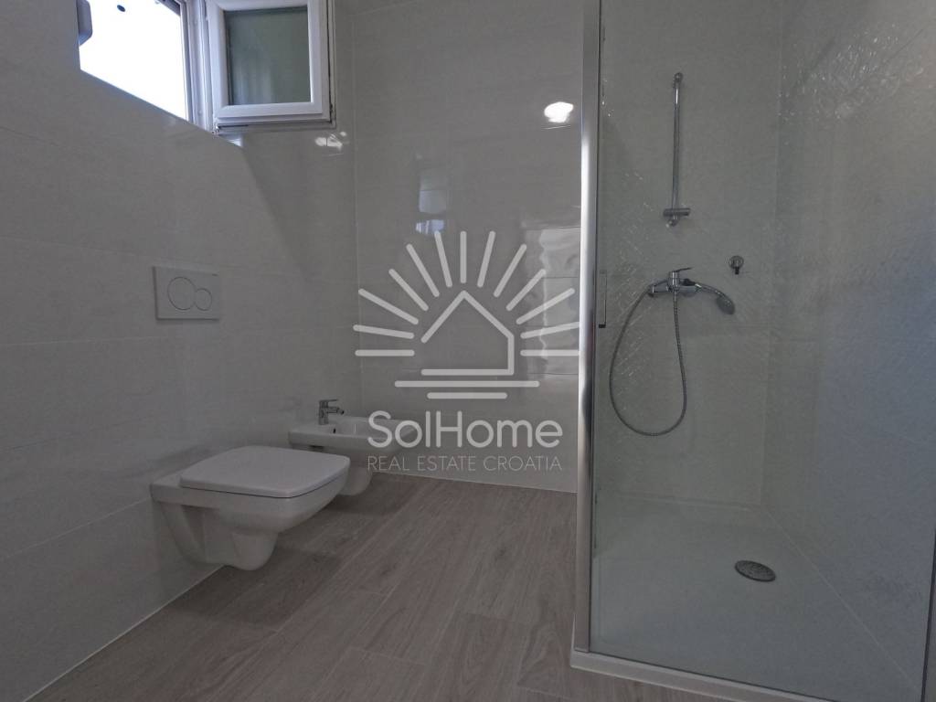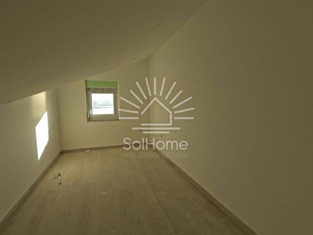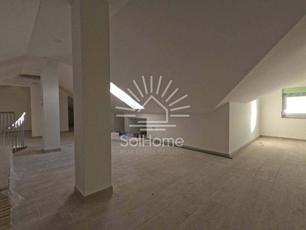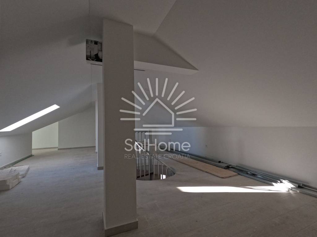 Na prvoj etaži se nalaze 2 spavaće sobe, 1 kupaonica, dnevni boravak, blagovaonica, kuhinja i prostrana terasa s panoramskim pogledom na more. Potkrovlje je povezano unutarnjim stubištem i sadrži dodatnu kupaonicu i 2 spavaće sobe.
