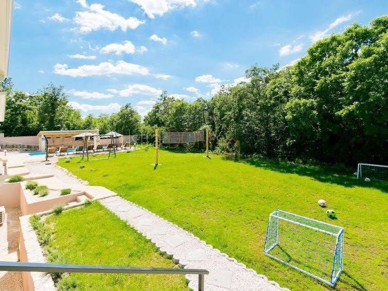 Okućnica od 1471 m² osigurava obilje prostora za uživanje na otvorenom. Na terasi je smješten vanjski namještaj i roštilj, savršeni za druženja i obroke na otvorenom. Bazen površine 44 m² pruža osvježenje tijekom ljetnih mjeseci, dok sustav navodnjavanja održava vrt u savršenom stanju.