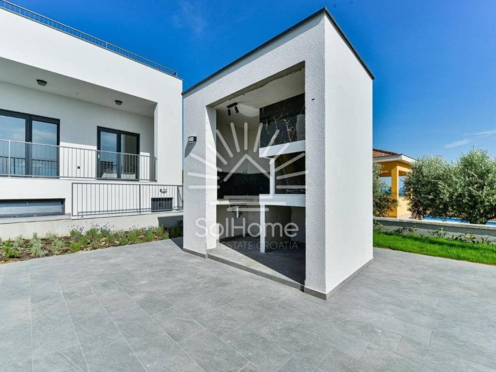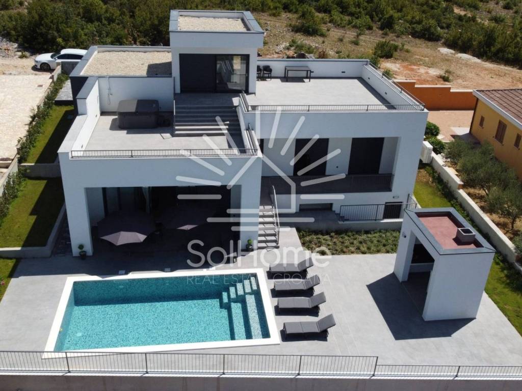 Kuća je građena u kaskadnom modernom stilu s krovnom terasom i vrhunskim sadržajima.