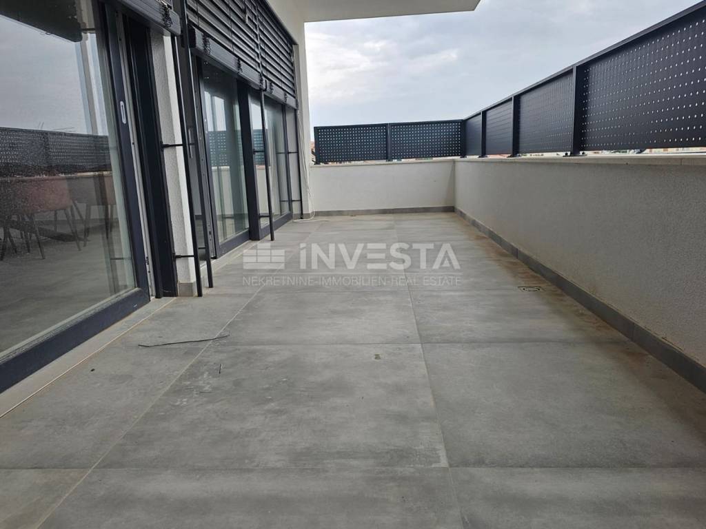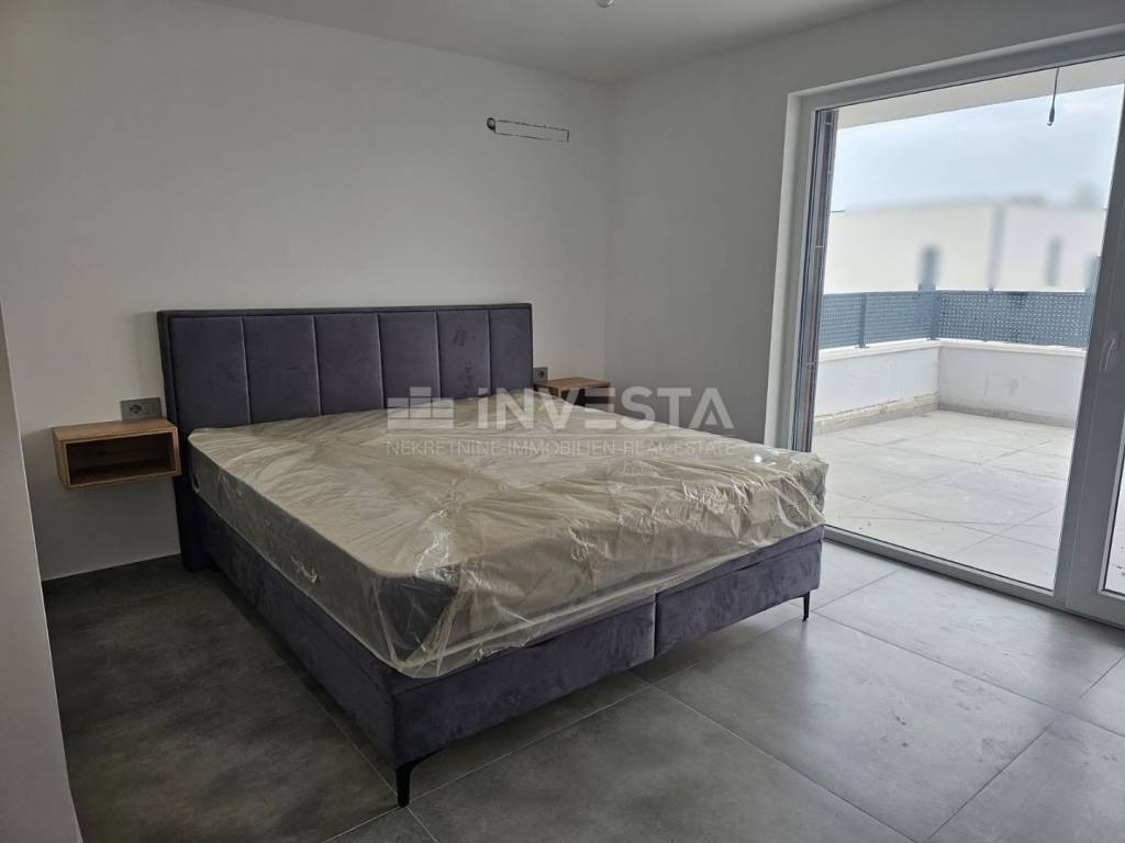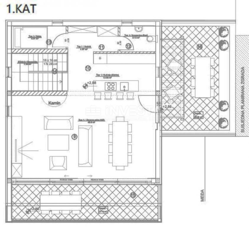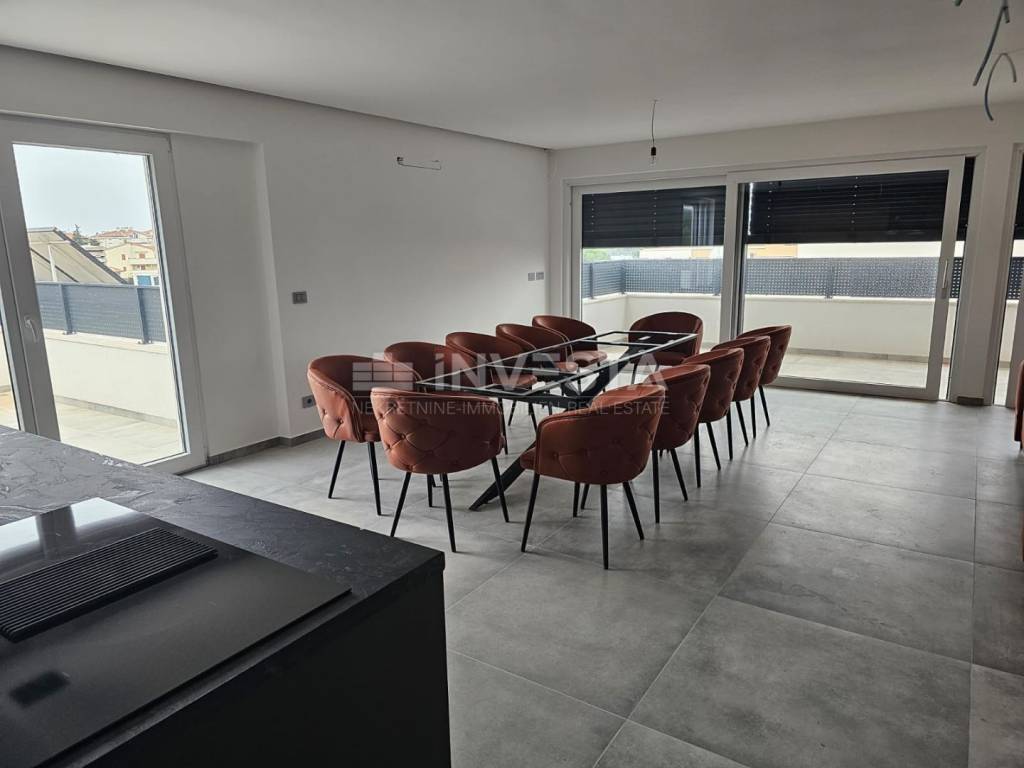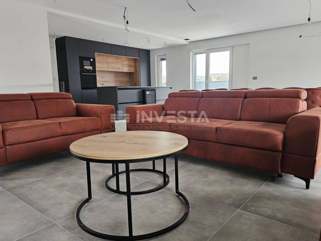 Kat: stubište vodi na veliki open space dnevni boravak, blagovaonicu i moderno opremljenu kuhinju. Tu se nalaze dodatno kupatilo, ostava, prostrana loggia i velika terasa s djelomičnim pogledom na more.