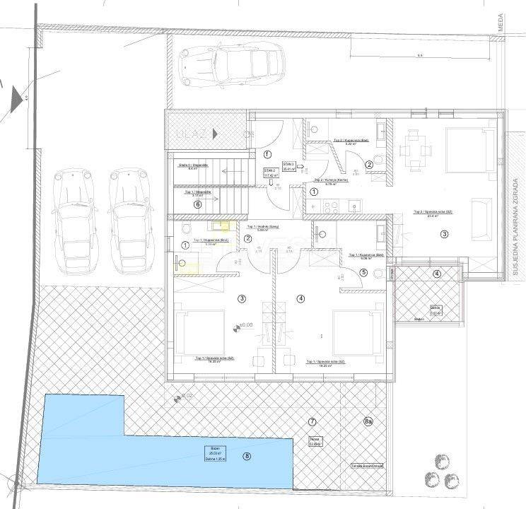 Prizemlje: ulazni hodnik, dvije prostrane spavaće sobe, svaka s vlastitom kupaonicom. Iz prizemlja se izlazi na natkrivenu terasu, sunčalište i bazen površine 25 m².