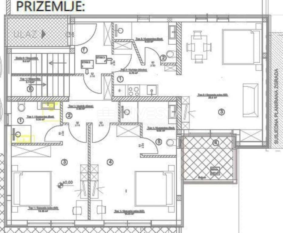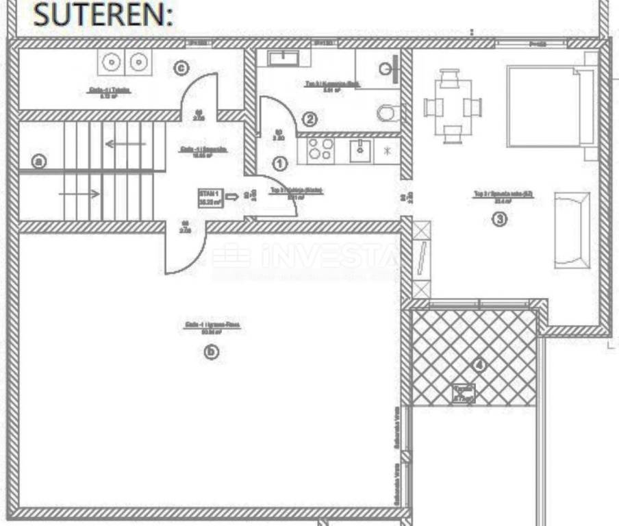 Prizemlje i suteren: svaki stan uključuje kuhinju, prostranu sobu koja služi kao spavaći i dnevni prostor, kupaonicu te terasu od 6 m².