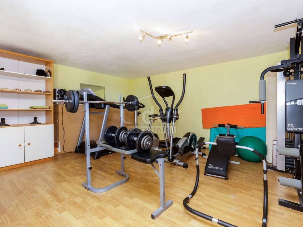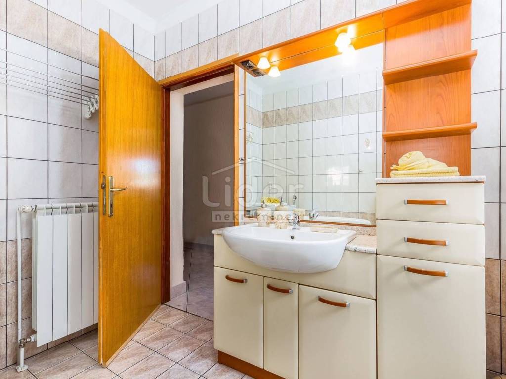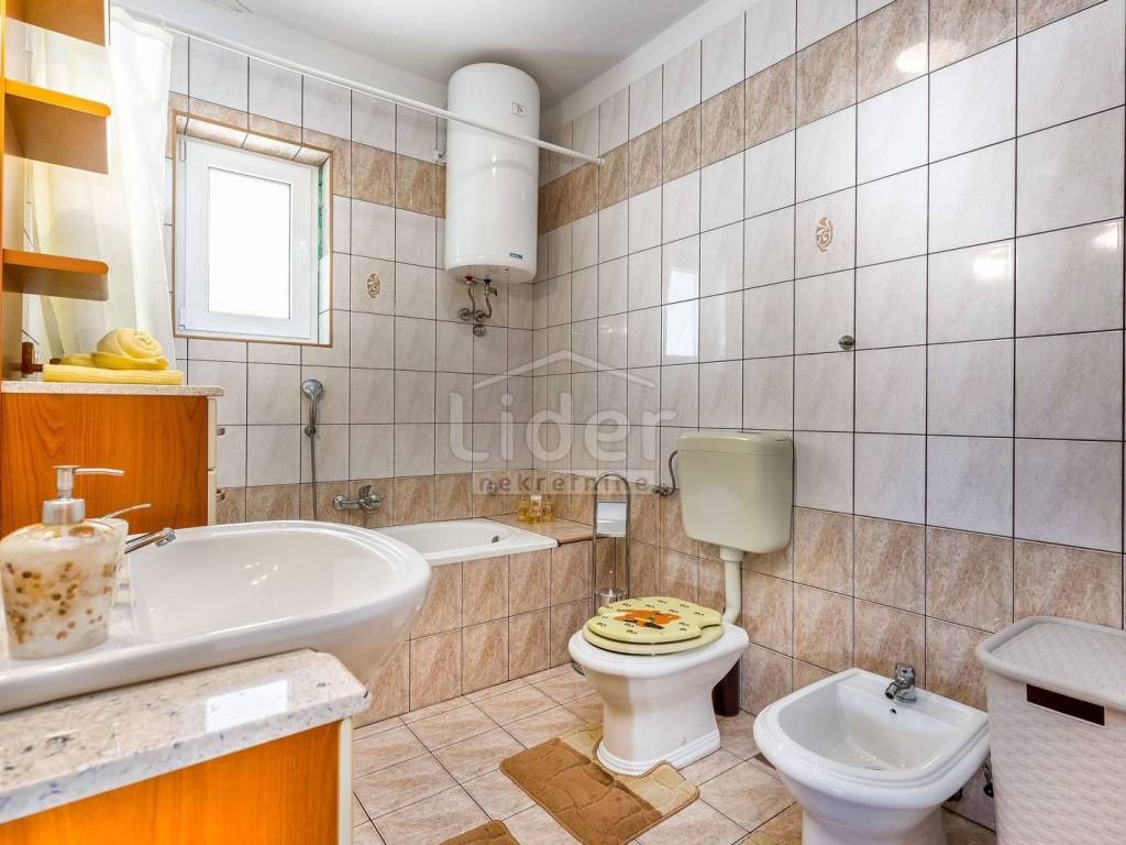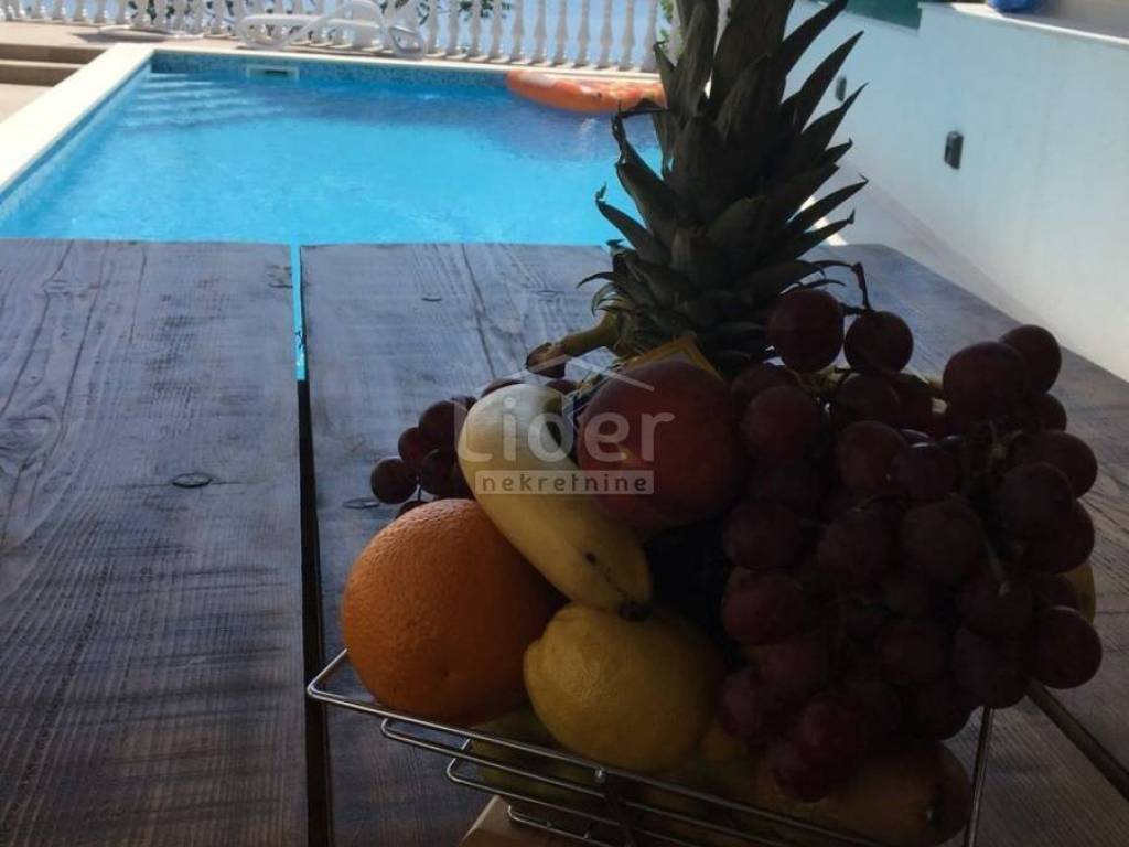 Prodajemo lijepu kuću s tri stambene jedinice, ukupne kvadrature 450m2. Kuća se nalazi na oko 2000 m od mora i centra grada i ima prekrasan pogled na more. Dva trosobna stana s dnevnim boravkom, jedan dvosoban sa dnevnim, teretana, spremište te garaža, bazen od 34m2 i okućnica od 650m2, čine ovu nekretninu idealnom za stalan boravak ili kao turističku nekretninu. Ovaj objekat je registriran kao kuća za odmor. Cijela kuća je klimatizirana te ima centralno grijanje.