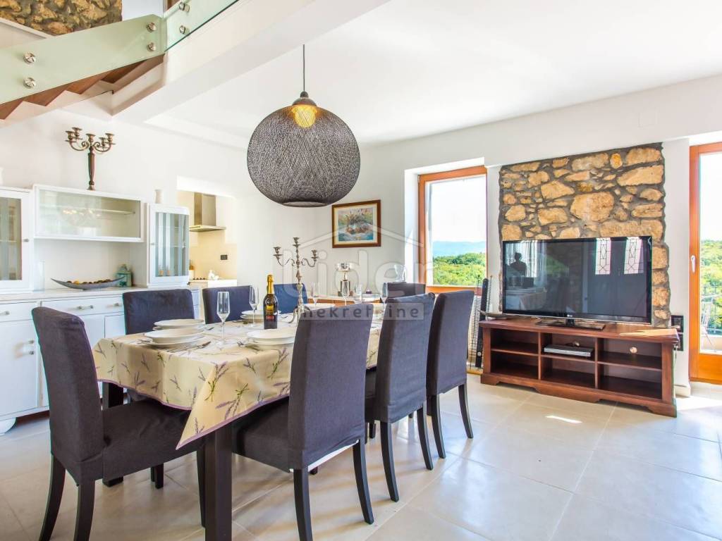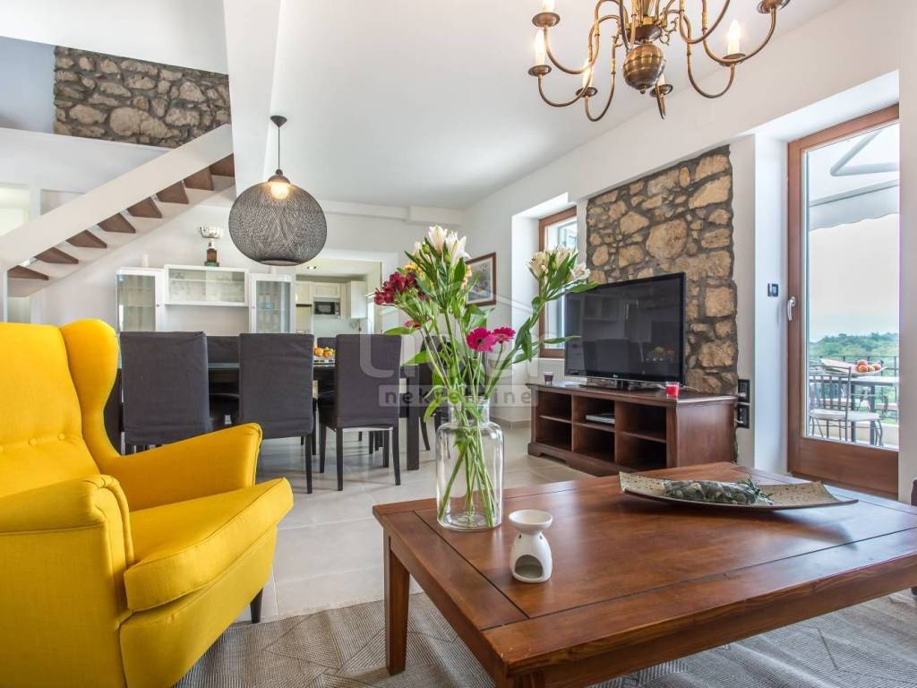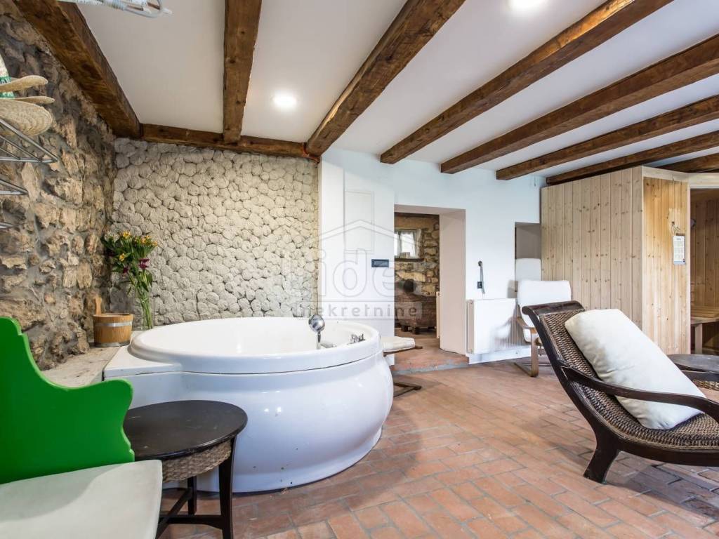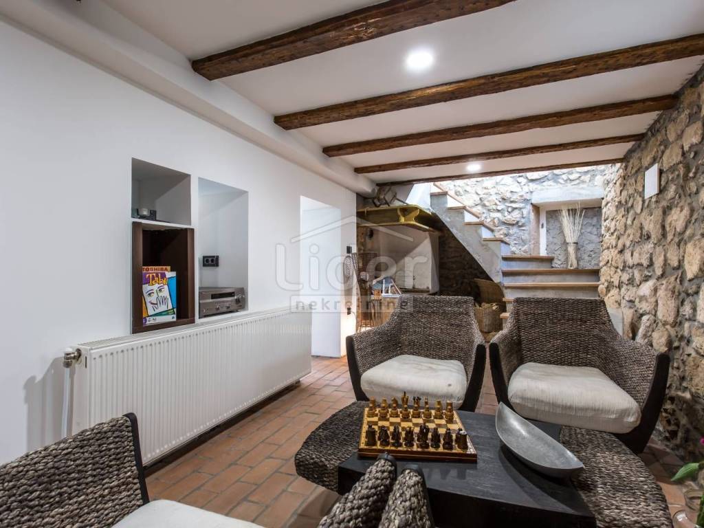 Vila se sastoji od suterena, prizemlja i prvog kata. U suterenu se nalazi prekrasni vinski podrum sa kaminom, prostor za druženje, sauna i unutarnji bazen. U prizemlju se nalaze dnevni boravak, kuhinja, blagovaona, jedna spavaća soba, kupaonica i terasa sa prekrasnim pogledom. Na prvom katu se nalaze 3 spavaće sobe, a svaka ima i vlastitu kupaonicu. Na uređenoj okućnici se nalazi bazen sa sunčalištem, dječje igralište i mjesto za roštilj.