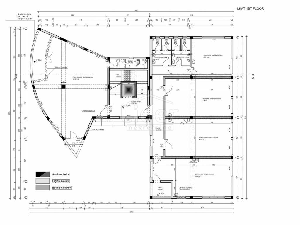 - I kat od 338,97 m2 neto površine: 5 poslovna prostora površine od 25, 43, 50 i 100 m2, i 3 sanitarna čvora s 5 toaletta;