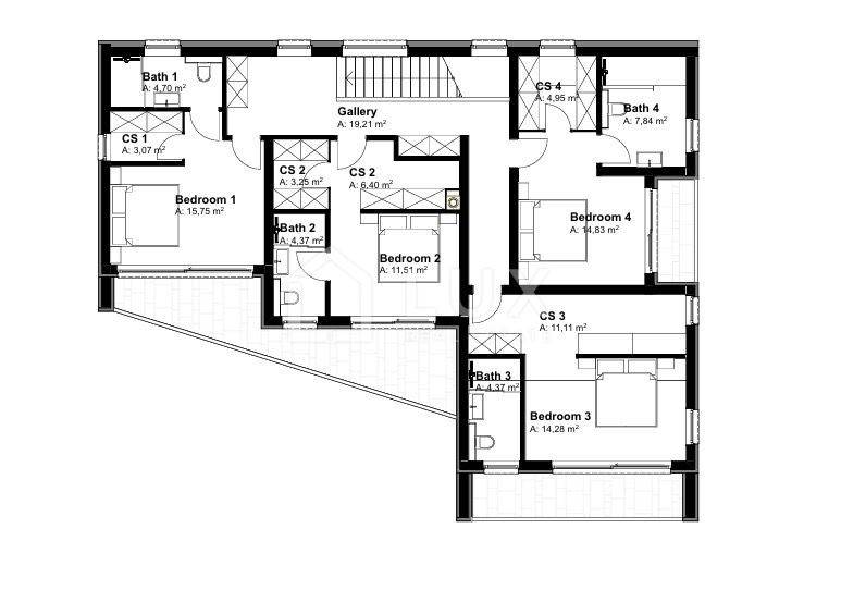 Stepenicama se dižemo na prvi kat koji ima predsoblje te 4 spavaće sobe. Svaka soba ima zasebnu walk-in garderobu i kupaonu, dvije južne sobe imaju zajedničku natkrivenu terasu, a master bedroom ima vlastitu natkrivenu terasu/loggiu.