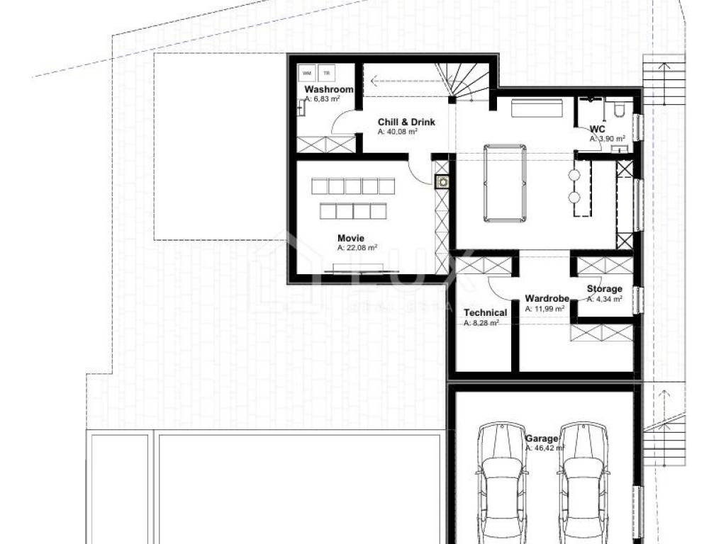 U suterenu se nalazi garaža površine 46m2 koja je predviđena za dva automobila, a biti će opremljena elektro punjačem, tehnička soba, spremište, garderoba, wc, vešeraj, kino dvorana i "chill and drink" prostor za druženje i uživanje iz kojega stepenice vode na prizemlje.