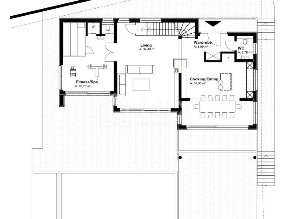Prizemlje se sastoji od ulaznog hodnika, wc-a, kuhinje sa blagovaonom i dnevnog boravka te fitness i spa oaze u kojoj se smjestila teretana i sauna sa tušem i wc-om. Sve prostorije imaju velike staklene stijene koje pružaju izlaz najprije na natkrivenu terasu a potom i prostranu okućnicu na kojoj se smjestio bazen veličine 10x5 m sa hidromasažnim dijelom te sunčalište.