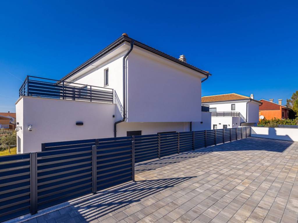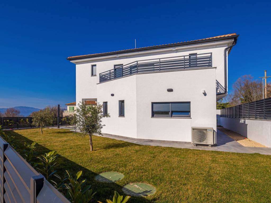 Vanjski prostor ove vile ograđen je i pažljivo uređen. Travnjak je oplemenjen mediteranskim biljem i maslinama, a bazen je smješten tako da pruža maksimalnu privatnost. U dvorištu se nalazi i parkirno mjesto za više vozila, čime je osigurana praktičnost i funkcionalnost.