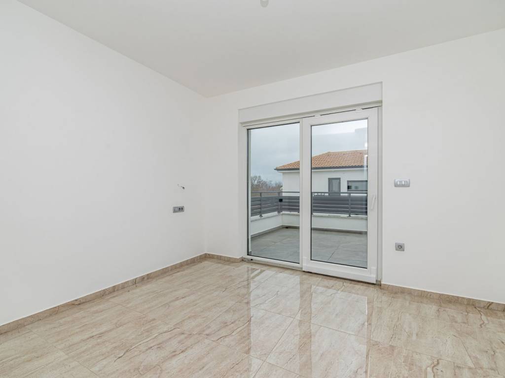 Na katu vile nalaze se tri spavaće sobe. Jedna od njih ima vlastitu kupaonicu, dok preostale dvije dijele zajedničku. Sve sobe na katu imaju izlaz na prostranu terasu s koje se pruža pogled na prirodu, a dijelom i na more, što dodatno doprinosi osjećaju luksuza i harmonije s okruženjem. Na katu se također nalazi još jedna terasa na koju se izlazi iz hodnika.