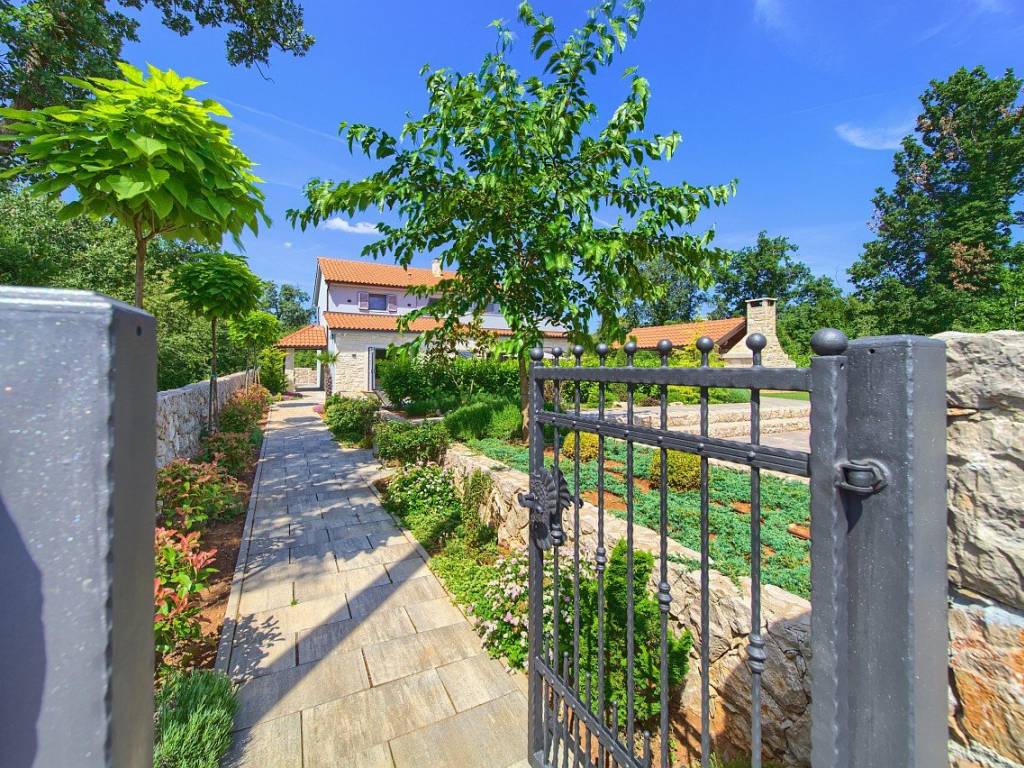 Okućnica površine 555 m² nudi grijani bazen od 32 m², jacuzzi, sunčalište, natkrivenu terasu s ljetnom kuhinjom i roštiljem te tri parkirna mjesta. Tu je i cisterna za kišnicu kapaciteta cca 50 m³, kao i sustav automatskog navodnjavanja i osvjetljenja vrta.
