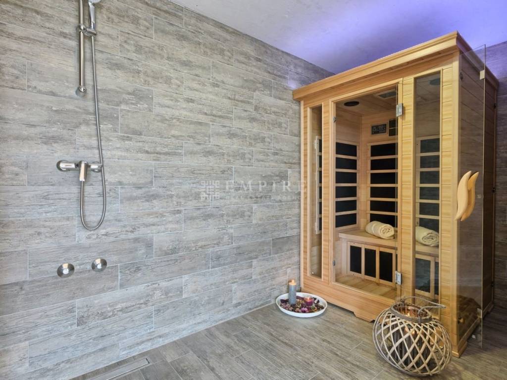 Vanjski dio kuće sastoji se od grijanog bazena, vanjskog jacuzzia, saune, dodatnog spremišta i natkrivene ljetne kuhinje.