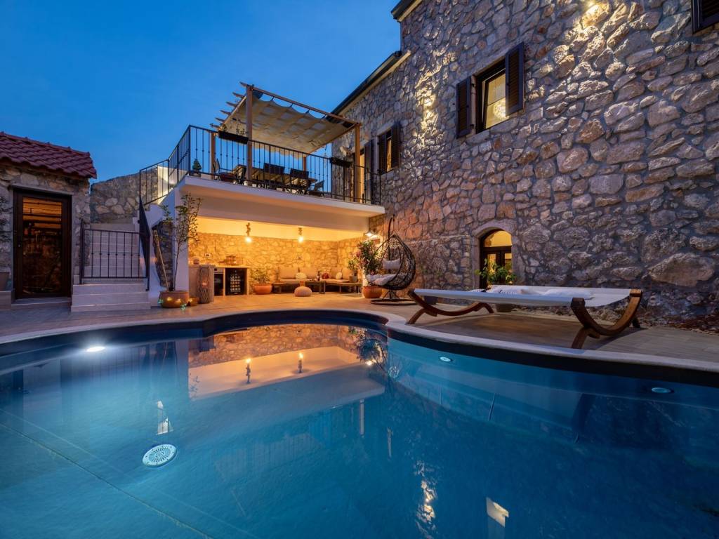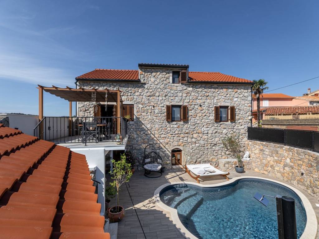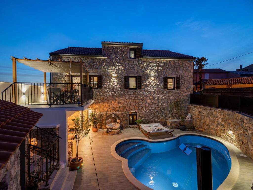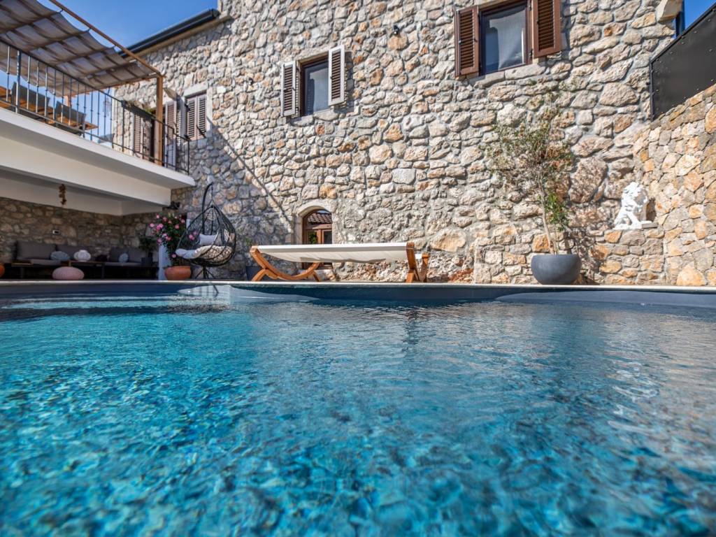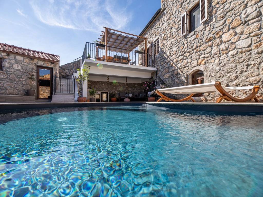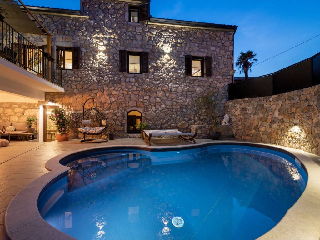 Na mirnoj lokaciji u mjestu Risika na otoku Krku, nalazi se ova impresivna kamena vila s bazenom, idealna za one koji traže spoj istinskog odmora, luksuza i privatnosti. Smještena na svega 1500 metara od mora, vila nudi savršen spoj mediteranskog šarma i moderne udobnosti.