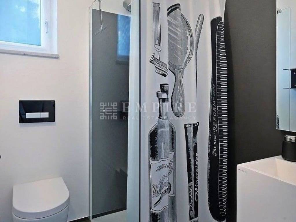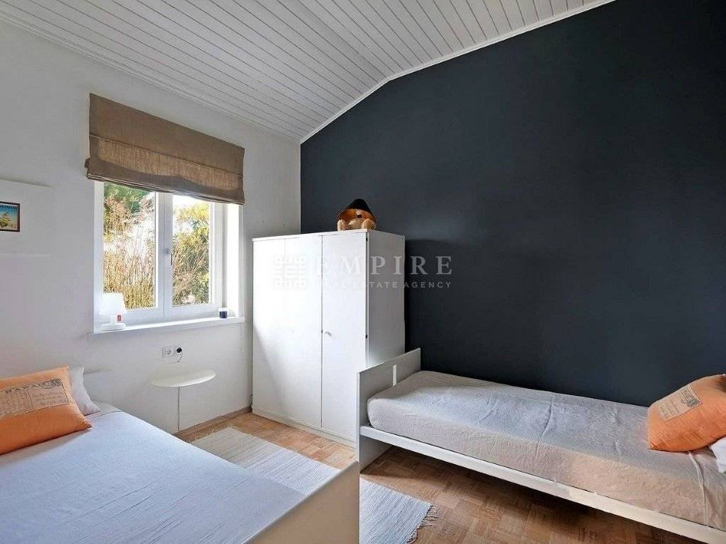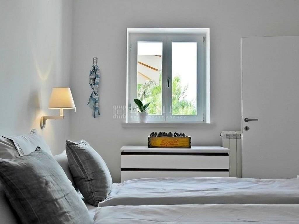 Komforna kuća proteže se na dvije stilski uređene i dobro opremljene etaže te sadrži dvije stambene jedinice ugodne atmosfere. U prizemlju se nalazi stan koji se sastoji od hodnika, kuhinje, spavaće sobe i kupaonice. Ostatak tlocrta nadopunjuje prostrana kupaonica s praonicom i ostavom. Na prvom katu se nalazi stambena jedinica sa prostranom terasom sa pogledom na more. Sastoji se od dnevnog boravka, kuhinje, tri spavaće sobe i kupaonice. Harmoniju zaokružuje potpuno ograđeni vrt koji je suptilno oplemenjen mirisnim cvjetovima jasmina i oleandra. Izuzetna prilika za miran obiteljski život uz miris mora, šum valova i blizinu kristalno čistog Jadrana, kao i investicija za turistički najam.