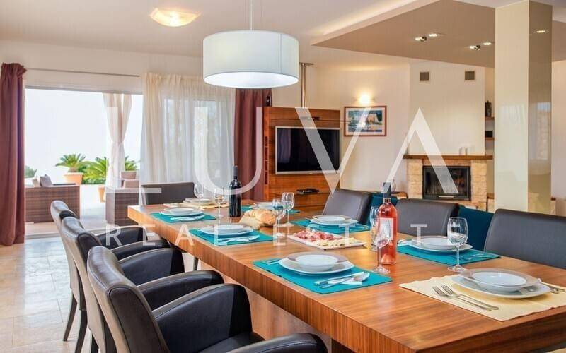 U prizemlju vile nalazi se prostrani dnevni boravak površine 80 m², povezan s blagovaonicom i potpuno opremljenom unutarnjom kuhinjom. Ovdje se možete opustiti u elegantnom, svijetlom prostoru koji spaja suvremeni dizajn s toplinom mediteranskog doma. Na prvom katu smješteno je sedam udobnih spavaćih soba, svaka s vlastitom kupaonicom, klimatizacijom, centralnim grijanjem i LCD zaslonom širokog ekrana.
