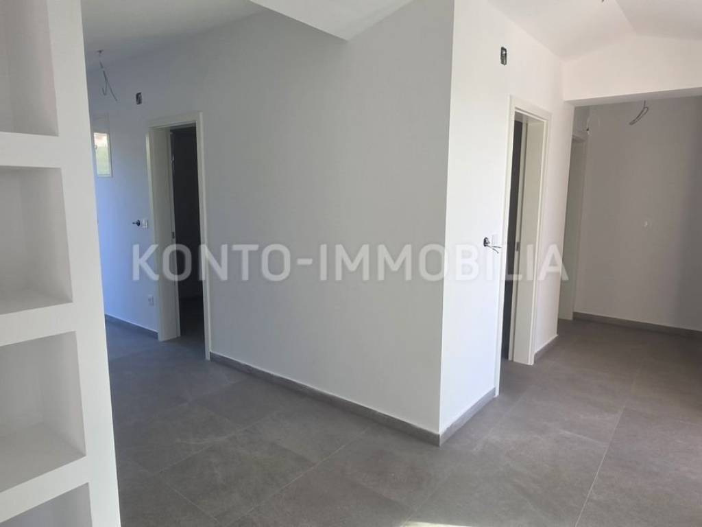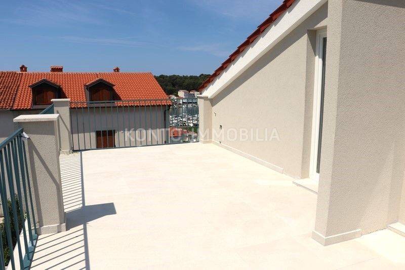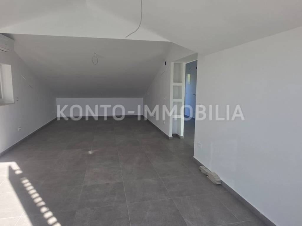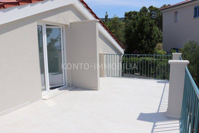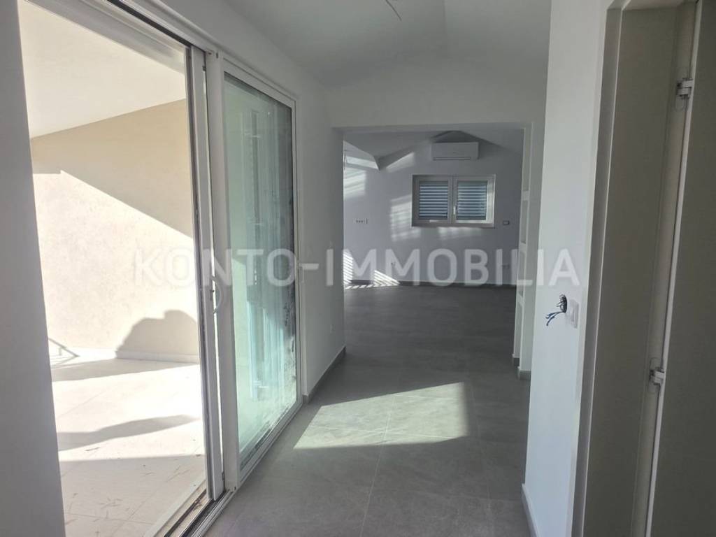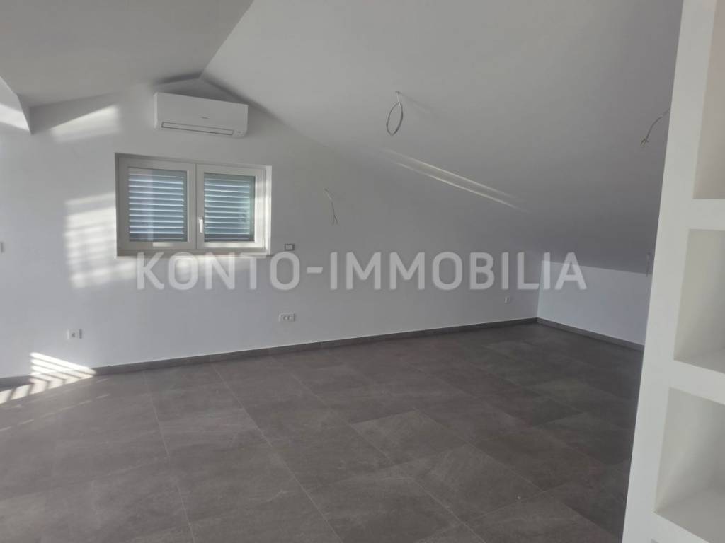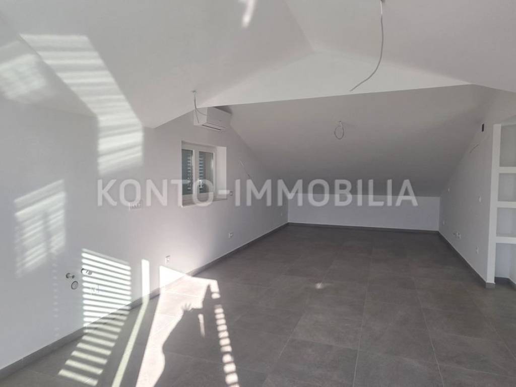 Ovaj moderan stan smješten u neposrednoj blizini stare gradske jezgre, na pješačkoj udaljenosti od plaže, restorana, trgovina i sa očaravajućim pogledom nalazi se u potkrovlju novogradnje, površine cca 135 m2. Interijer uključuje dnevni boravak sa blagovaonicom i kuhinjom otvorenog koncepta, dvije spavaće sobe i dvije kupaonice. Stan krase i dvije terase na kojima ćete zasigurno provoditi nezaboravne trenutke uz prekrasan pogled i zalaske sunca. Uz stan dolaze i dva parkirališna mjesta, prostrano spremište površine cca 10 m2 te vrt površine cca 40 m2. U pripadajućem dijelu vrta izvedene su pripreme za roštilje te instalacije vode, odvoda i struje.