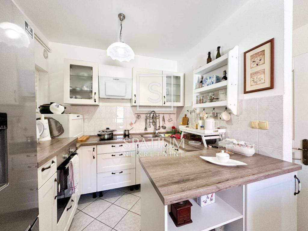 Apartman površine 39 m2 sastoji se od kuhinje, dnevnog boravka, spavaće sobe i toaleta, te izlaza na terasu natkrivenu vinovom lozom i vrt sa mandarinama, narom i ostalim mediteranskim biljem.