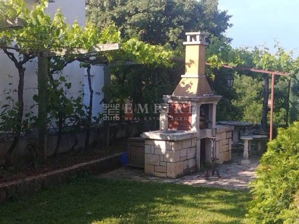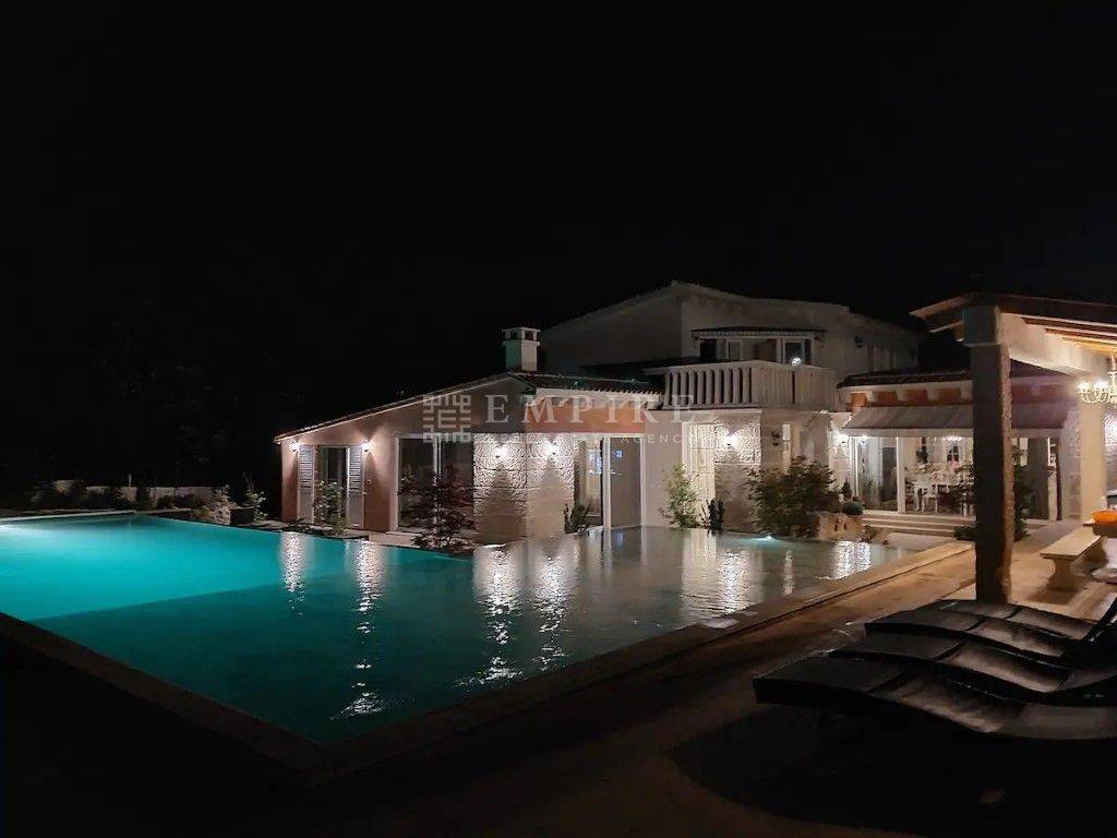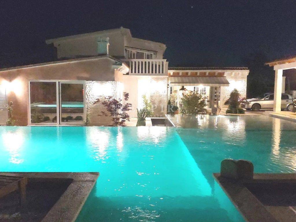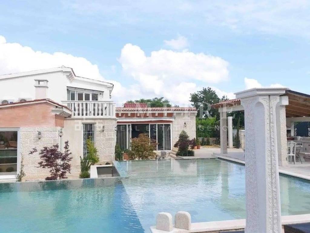 Luksuzna vila s bazenom od 150 m² Okružena stoljetnom šumom i smještena na brežuljkastom platou u blizini Pazina. Ovdje je manje zastupljena tipična istarska arhitektura, ali je primjetan osjetan utjecaj sjevera u gradnji. Kuće su ovdje većinom pokrivene kamenim kapcima koji su od vremena posijedjeli. U malom mjestu u srcu Istre, okružena prekrasnom prirodom, nalazi se luksuzna vila u stilu vintage kamena na površini od 1020 m². Površina vile je 260 m2 i uključuje četiri spavaće sobe, četiri kupaonice, veliki dnevni boravak i kuhinju. Jedan od sadržaja u spavaćoj sobi je i sauna. Podno grijanje je dostupno u svim sobama. Ova zanimljiva vila sa čvrstim kamenim karakterom ima bazen sa slanom vodom do 150 m² na tri razine (25 cm, 45 cm, 140 cm) i dvije vanjske kuhinje na drva i plin. PRILIKA!!!