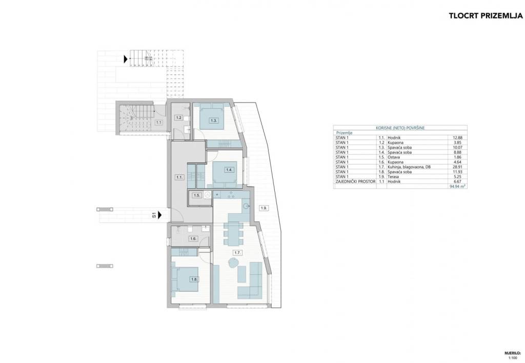 Stan se sastoji od prostranog ulaznog prostora, otvorenog dnevnog boravka povezanog s kuhinjom i blagovaonicom, tri udobne spavaće sobe, dvije moderne kupaonice, ostave te natkrivene terase. Terasa vodi na uređenu i privatnu okućnicu s bazenom i sunčalištem, što ovaj apartman čini idealnim za opuštanje i uživanje tijekom cijele godine.