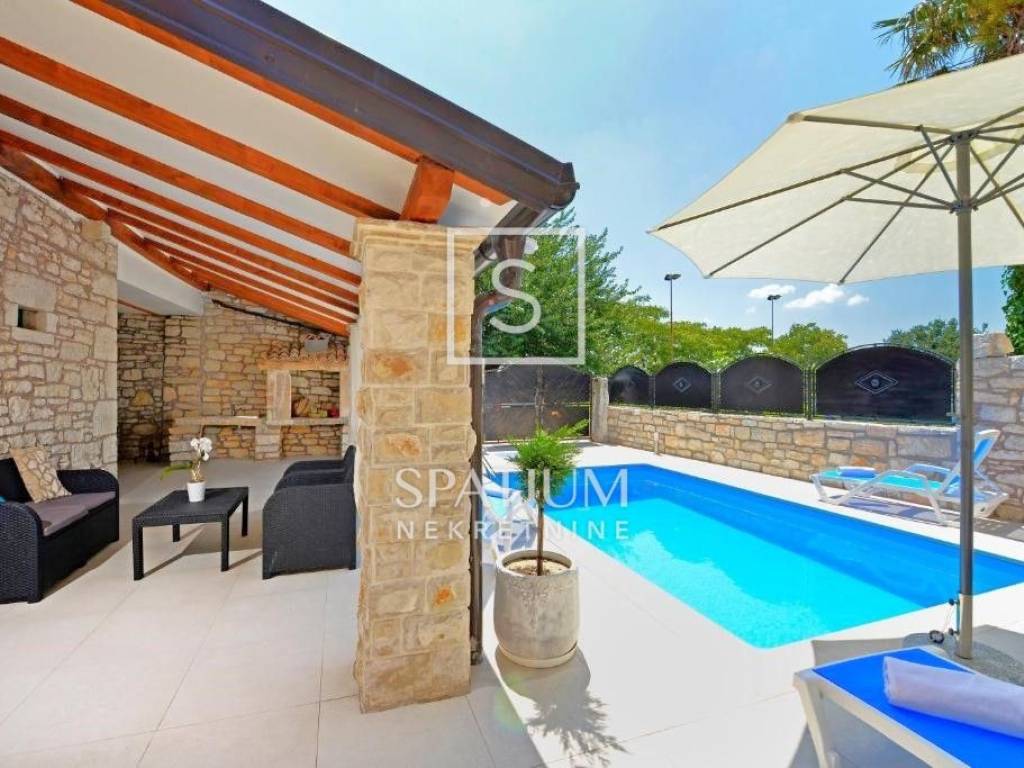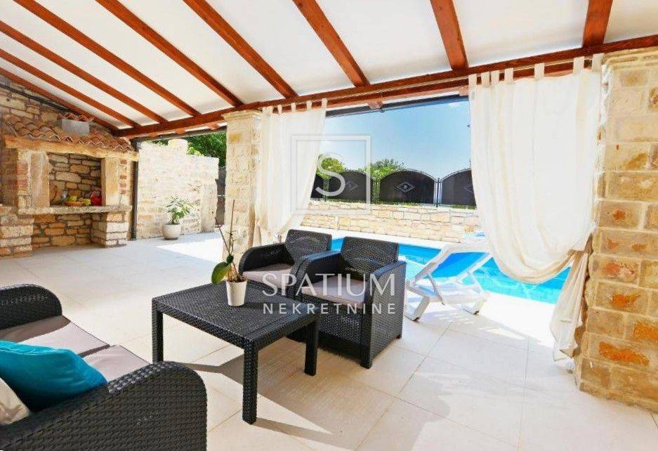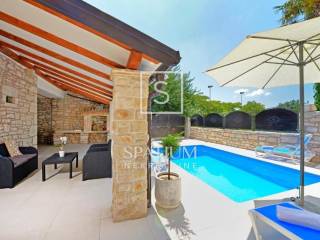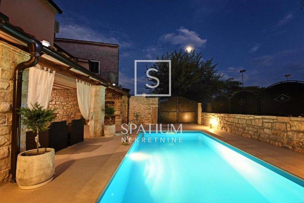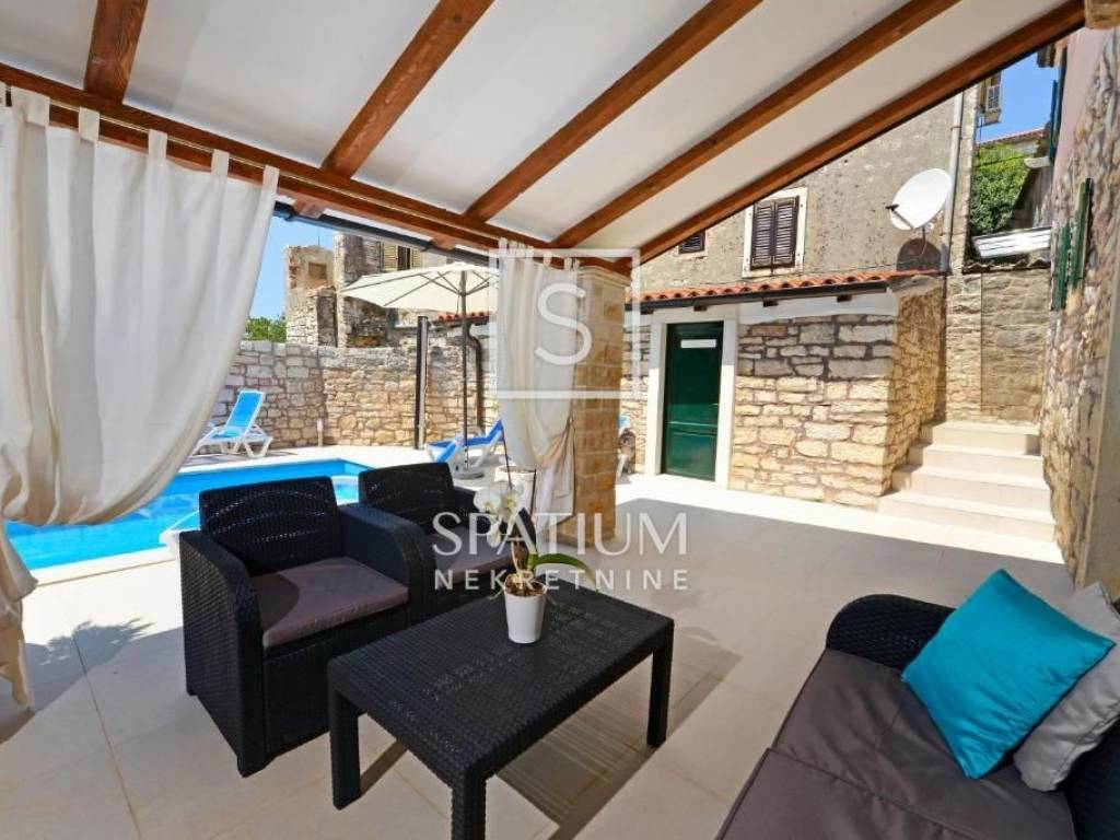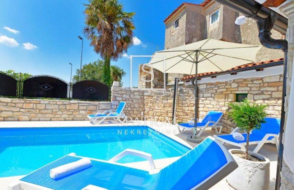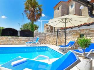 SVETI LOVREČ, u ponudi je kamena kuća s bazenom, katnica, površine 160 m2. U prizemlju se nalazi dnevni boravak, kuhinja s blagovaonom te stubište koje vodi na kat. Tu su dvije spavaće sobe, svaka s kupaonom, a iz veće spavaće sobe izlazi se na balkon. Na katu se nalazi prostorija koja vodi do šterne koja se može urediti kao još jedna terasa, a orijentirana je prema mjestu.