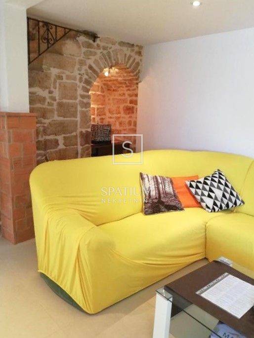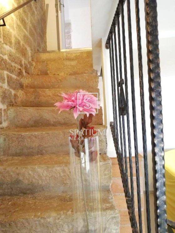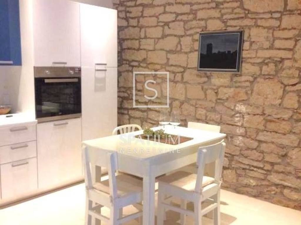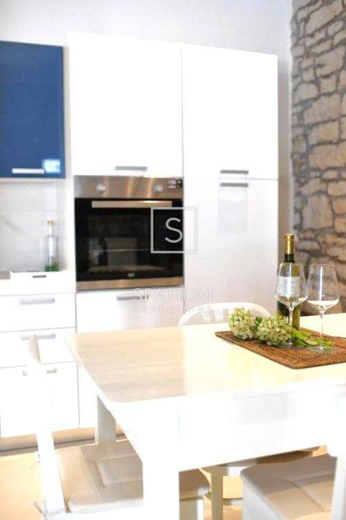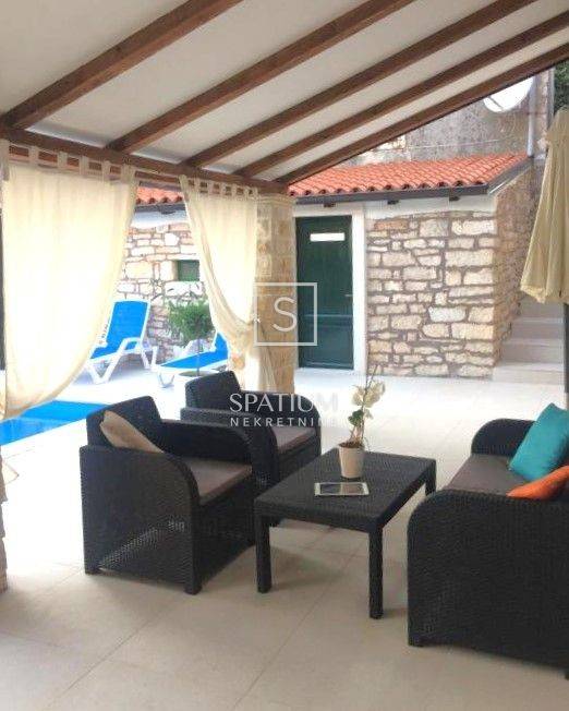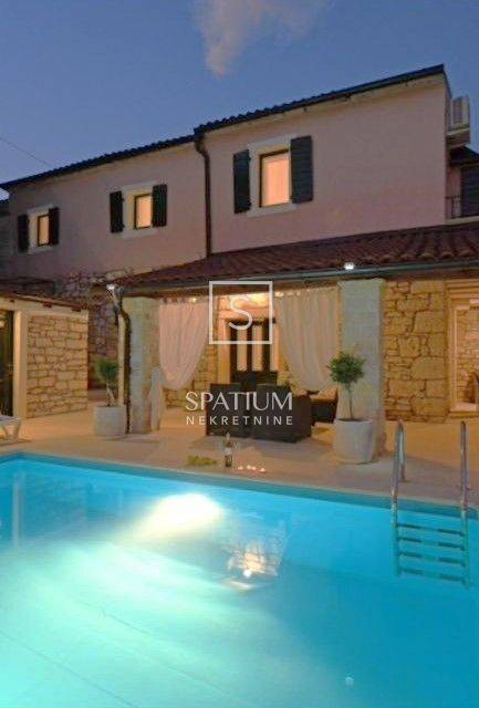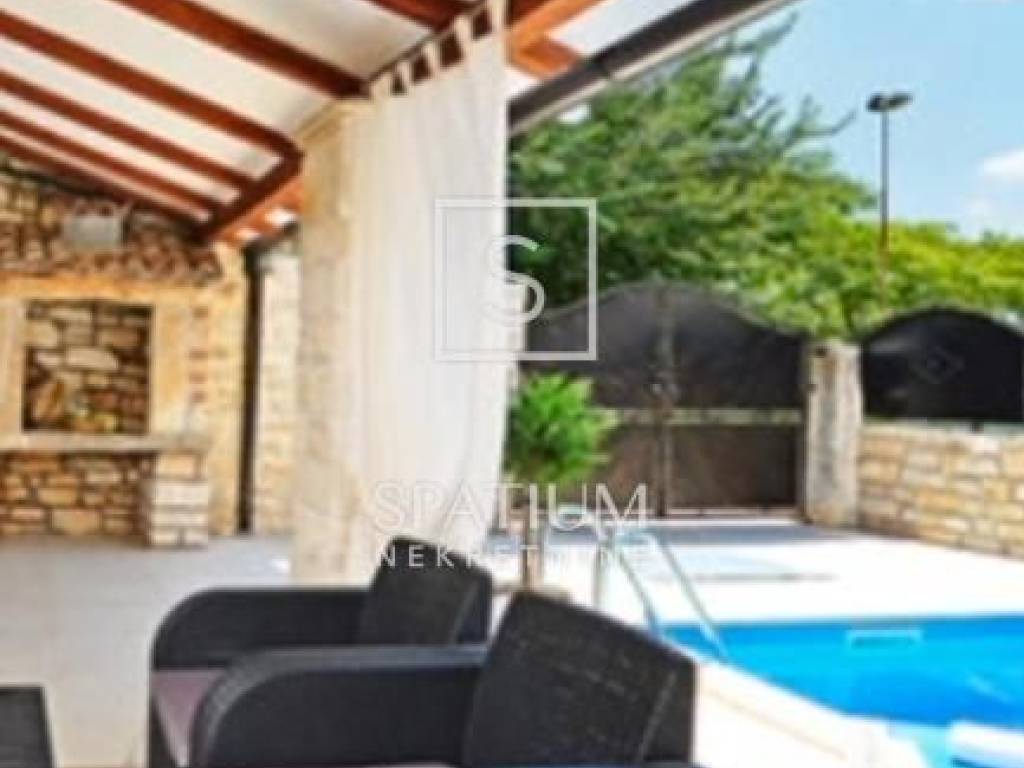 SVETI LOVREČ, u ponudi je kamena kuća s bazenom, katnica, površine 160 m2. U prizemlju se nalazi dnevni boravak, kuhinja s blagovaonom te stubište koje vodi na kat. Tu su dvije spavaće sobe, svaka s kupaonom, a iz veće spavaće sobe izlazi se na balkon. Na katu se nalazi prostorija koja vodi do šterne koja se može urediti kao još jedna terasa, a orijentirana je prema mjestu.