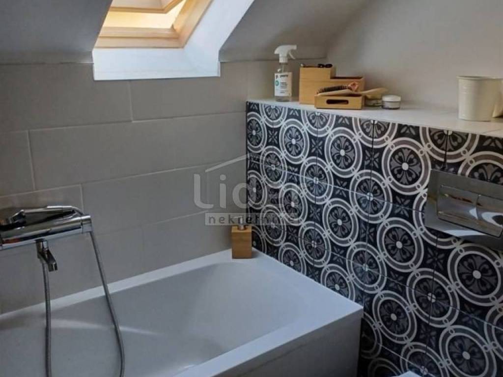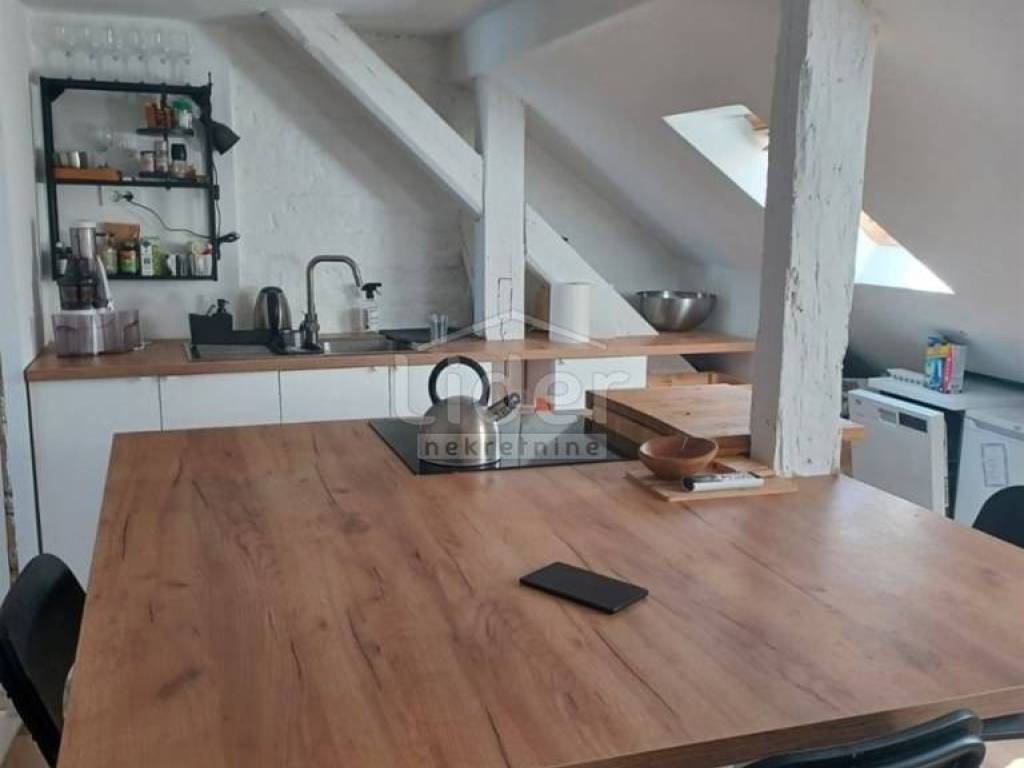 Stan je kompletno adaptiran, sastoji se od kuhinje, tri sobe, hodnika, kupaone, a visina stopa je od 2,25 do 1,20m.