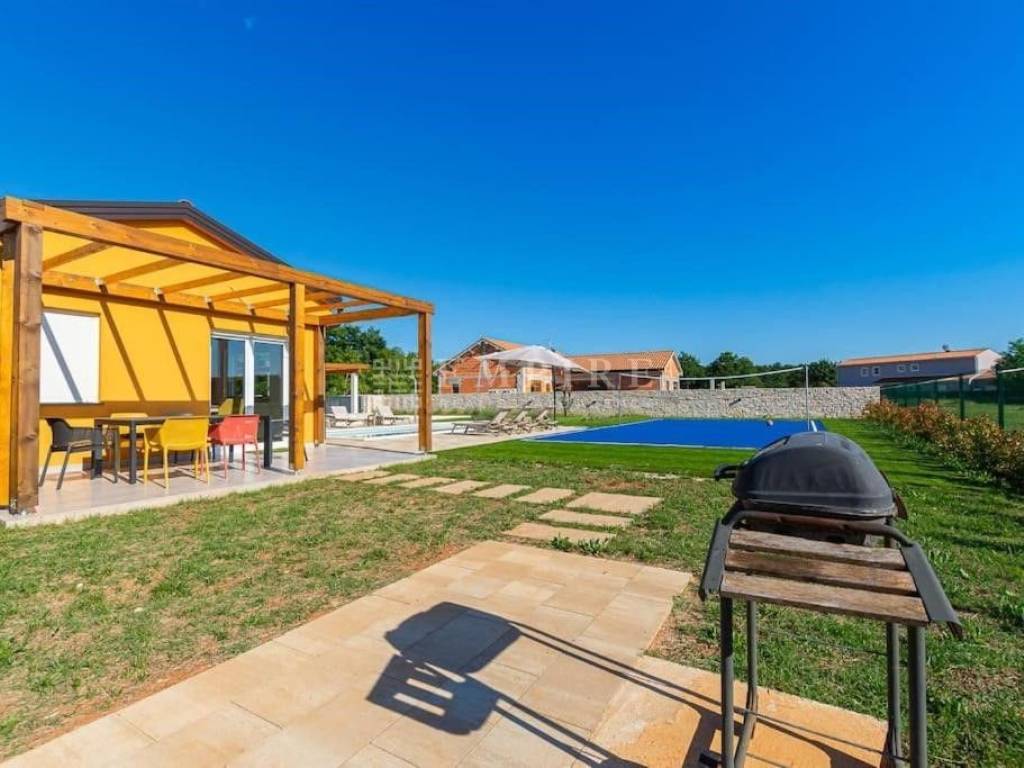 Prostrana okućnica nudi bazen (čišćenje elektrolizom), natkrivenu terasu kao i natkriveni dio za parkiranje uz ostali prostor za vaše limene ljubimce.