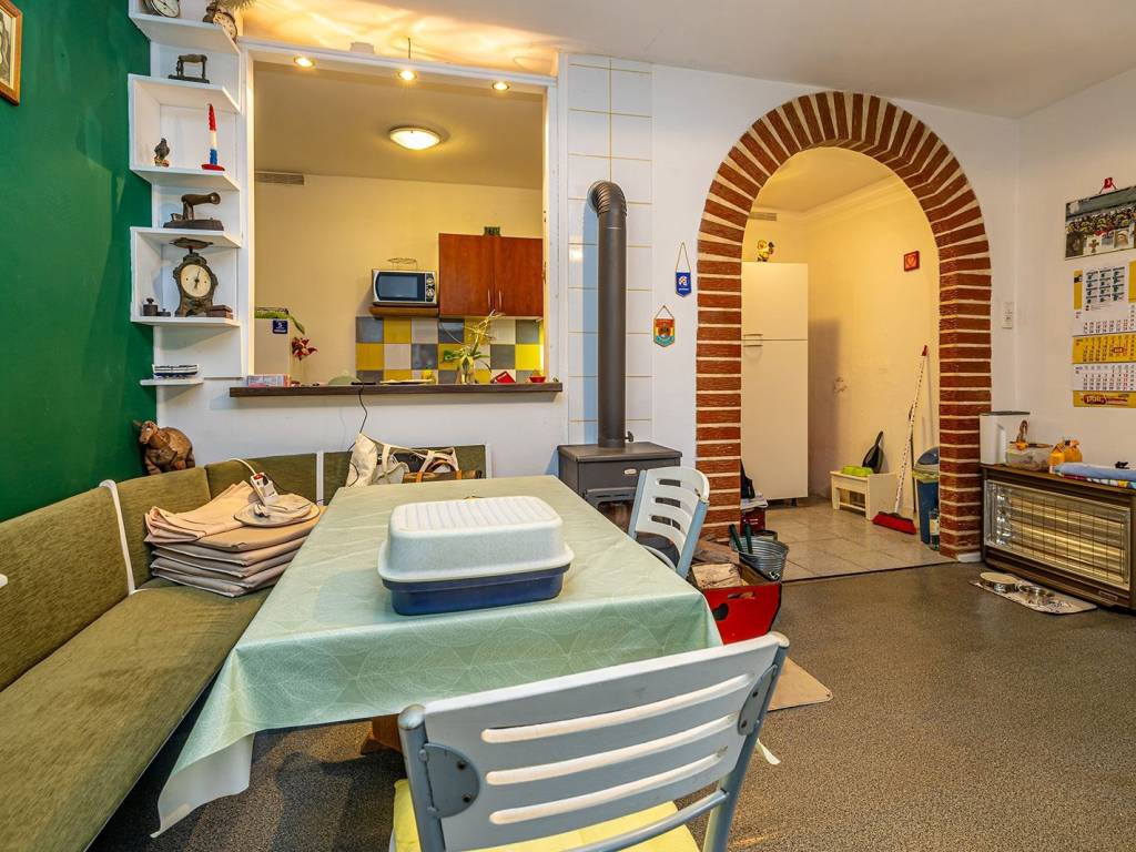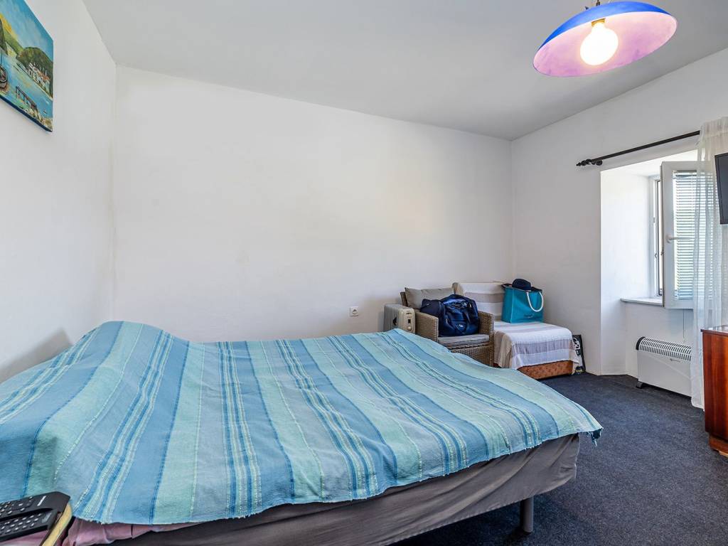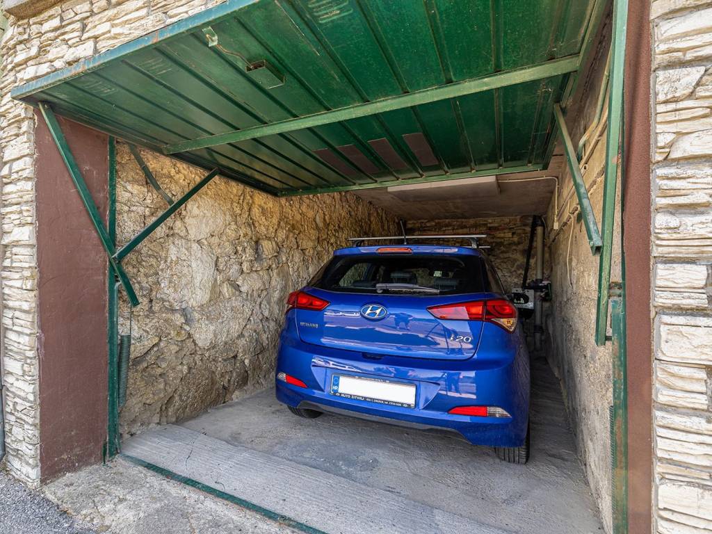 Kuća se prostire na tri etaže. U prizemlju se nalazi autentična konoba, savršeno mjesto za druženja i opuštanje u toplom ambijentu, te dodatna prostorija koja se može jednostavno preurediti u kupaonicu. Uz kuću je smještena garaža, iznad koje je uređena terasa s roštiljem, pogodna za boravak na otvorenom tijekom toplijih mjeseci.