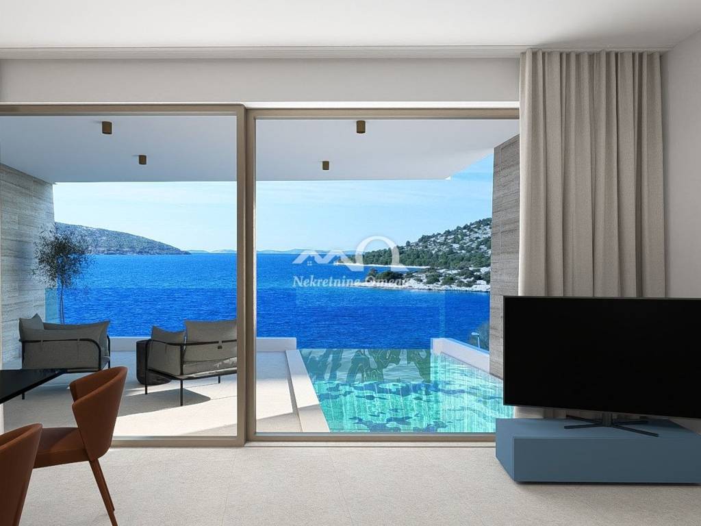 Ovaj trosobni stan u prizemlju nudi jedinstvenu kombinaciju luksuza, privatnosti i vrhunske lokacije uz more, s privatnim bazenom i panoramskim pogledom na Šibenski kanal i okolne otoke.