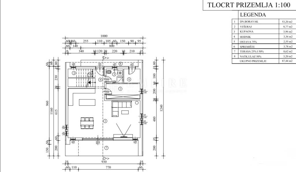 Prizemlje: Dnevni boravak, vešeraj, kupaonica, ostava, spremište, terasa