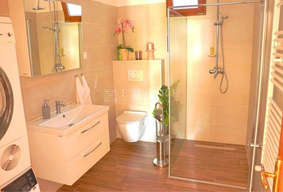 Unutarnjim drvenim stepenicama pristupa se katu gdje se nalaze tri spavaće sobe. Jedna je master spavaća soba s vlastitom kupaonicom, dok druge dvije spavaće sobe dijele zajedničku veliku kupaonicu s kadom, tušem i saunom. Na katu se nalaze i garderoba te terasa s predivnim pogledom na zelenilo i prirodu.