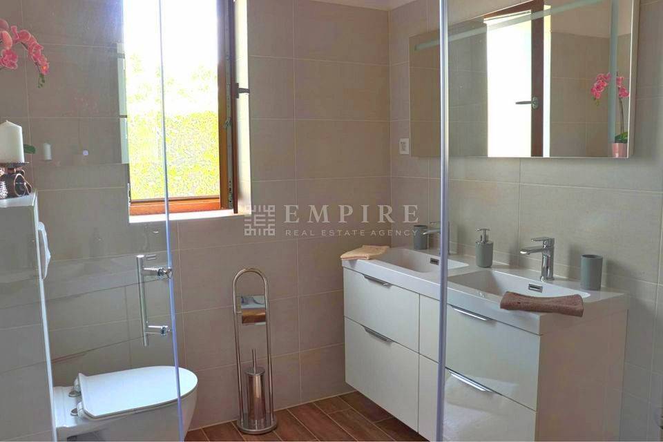 Vila ima natkriveni parking i garažu, a građena je od kvalitetnih materijala s drvenim podovima i stolarijom. Visoki stropovi, drvene grede i prekrasni kameni detalji daju kući poseban autohtoni stil. Grijanje je centralno na plin, s podnim grijanjem u kupaonicama, dok je hlađenje omogućeno klima uređajima.