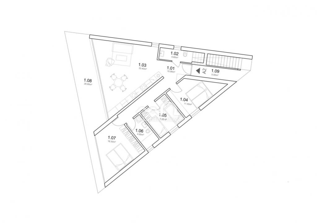 Luksuzni stan A2 smješten je na prvom katu vile A i prostire se na 125,60 m².