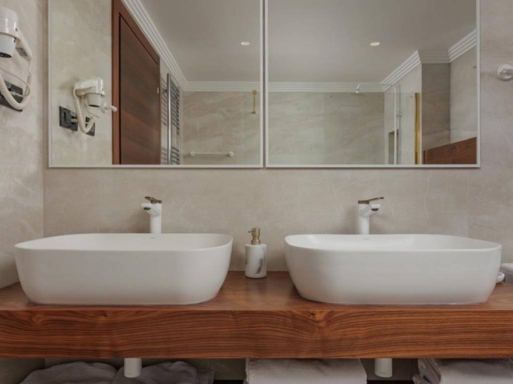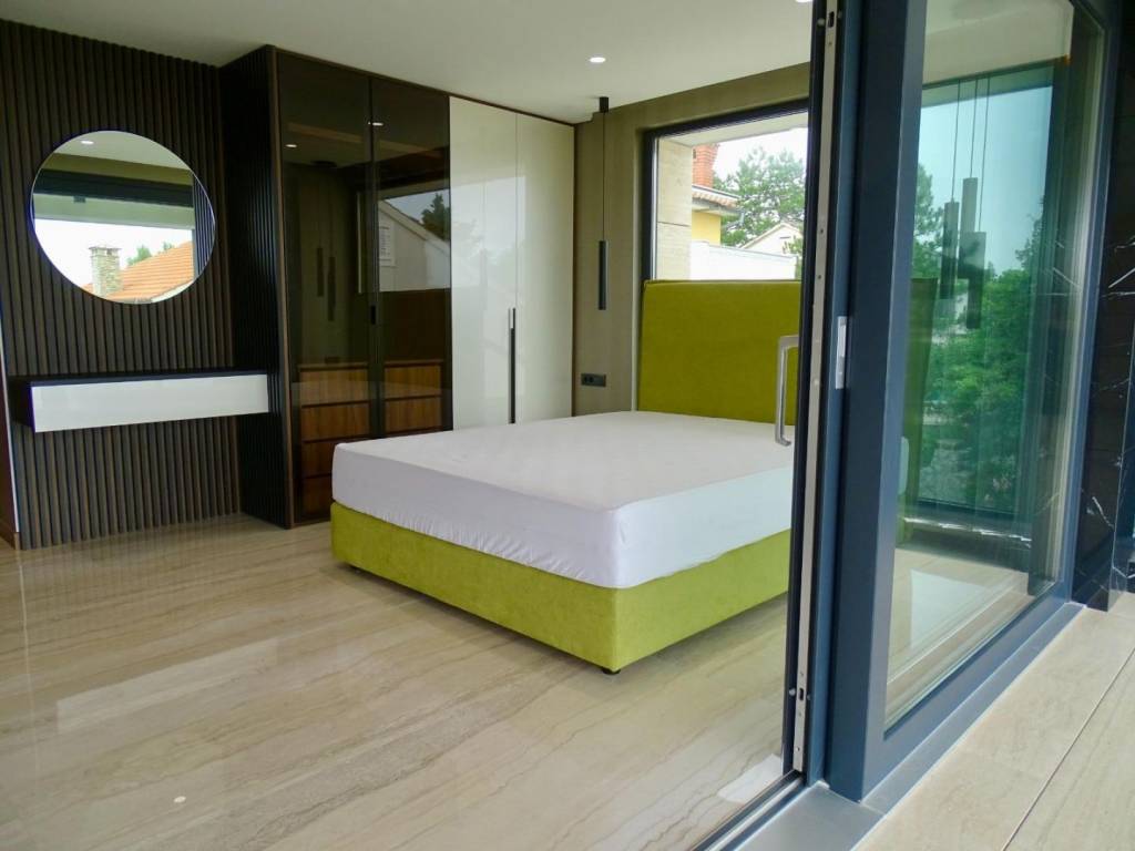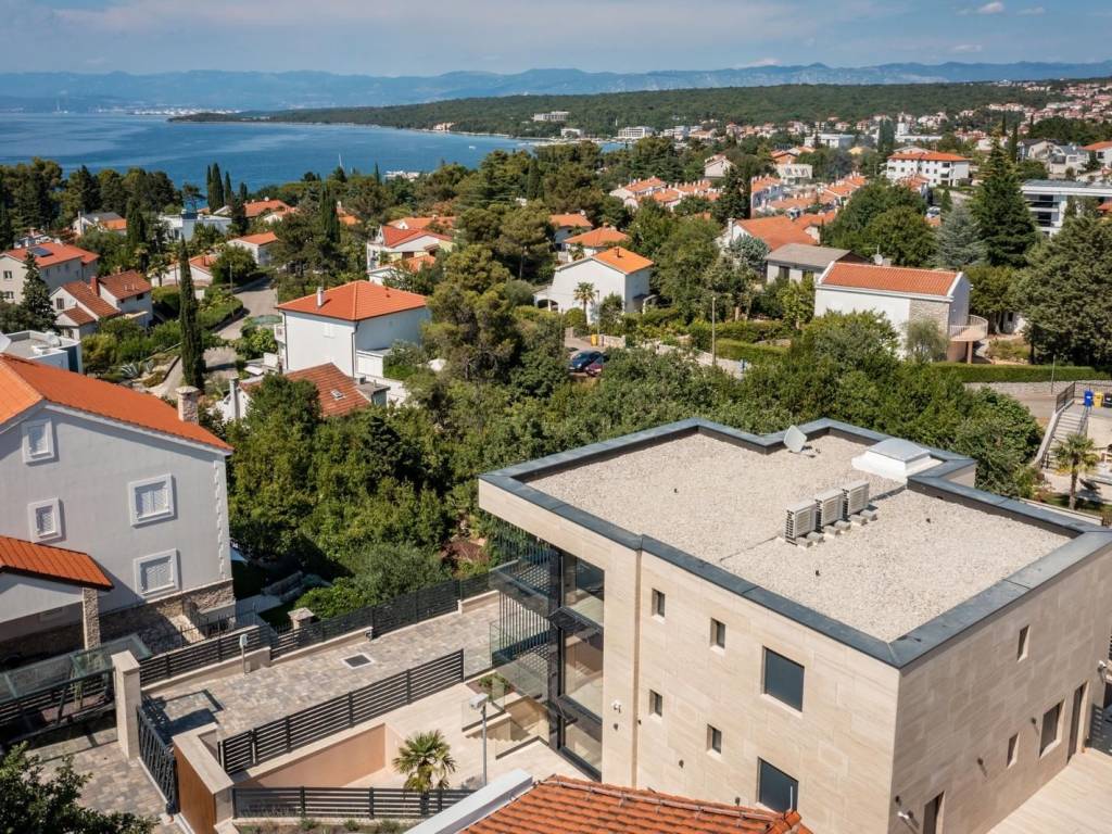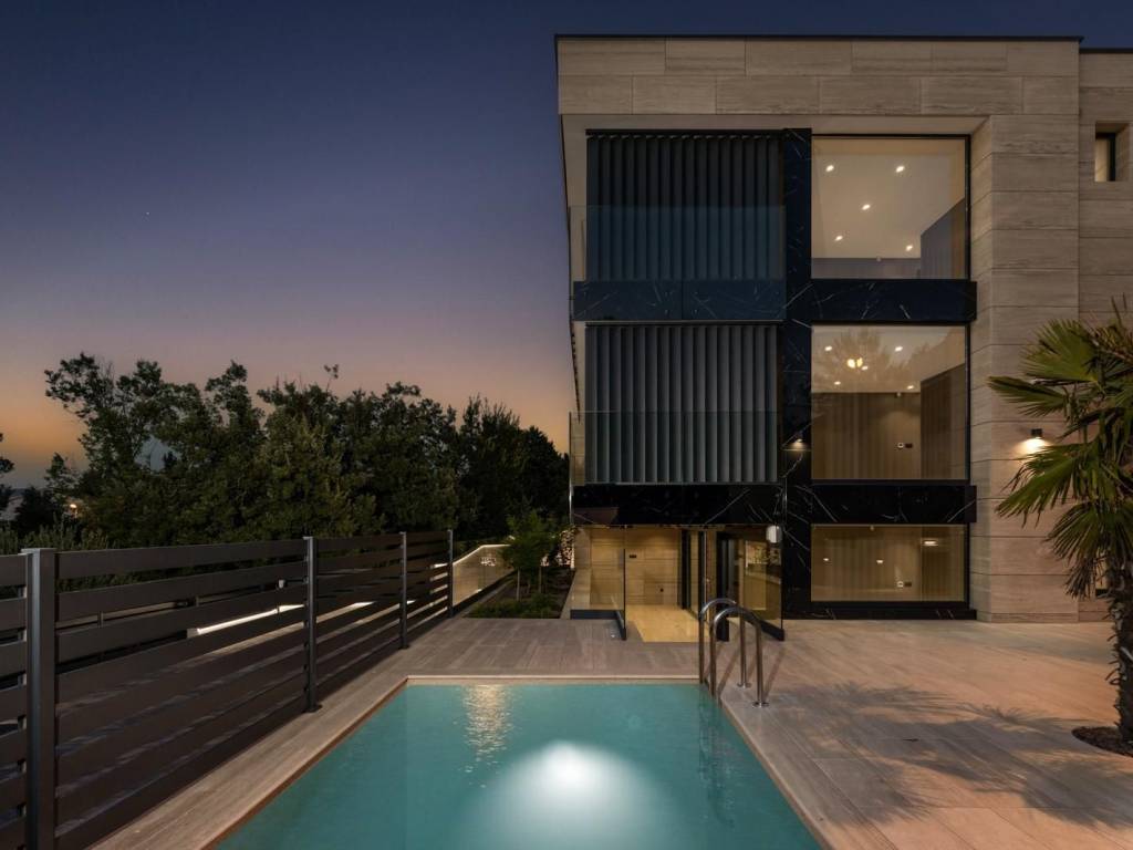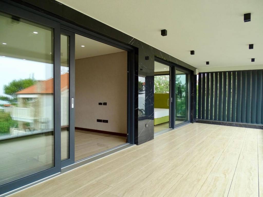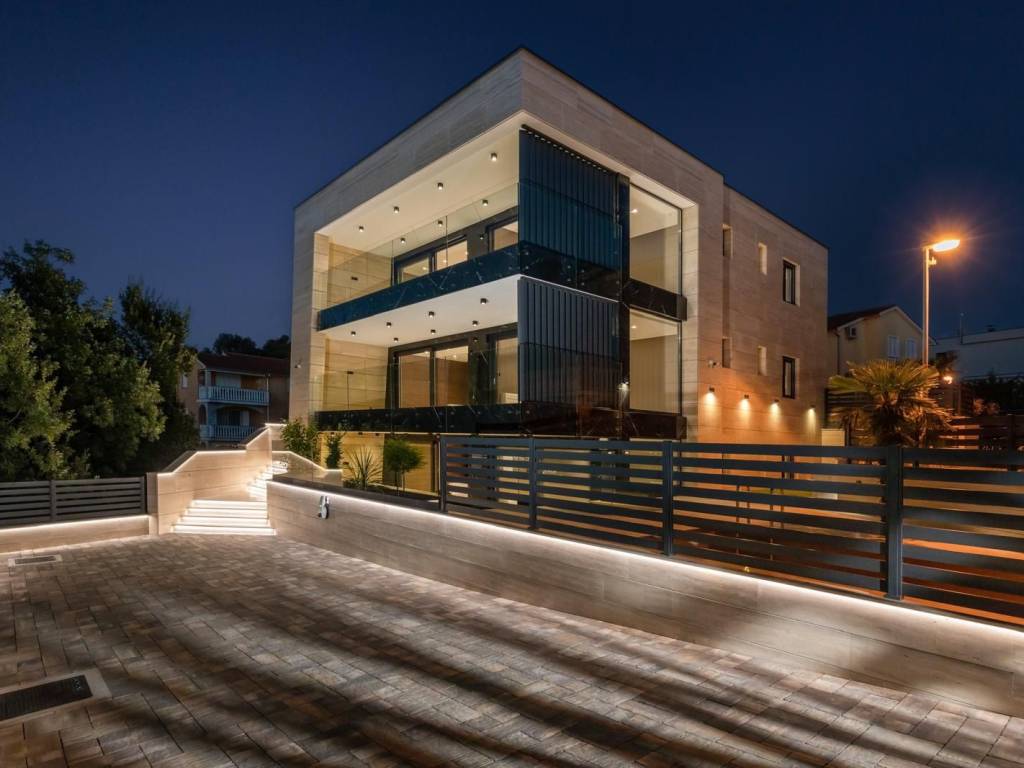 Kvaliteta gradnje i završne obrade vidljivi su u svakom detalju: podno grijanje, Mitsubishi klimatizacija u svim prostorijama, luksuzna keramika, podizno-klizne stijenke koje povezuju interijer s vanjskim prostorom, spušteni stropovi s integriranom rasvjetom te talijanska vrata od orahovine. Fasada od Rimskog kamena Travertin naglašava profinjen karakter objekta, dok su sigurnosni sustavi poput alarma i videonadzora već ugrađeni. Drveni dekorativni paneli dodatno oplemenjuju prostor toplinom i stilom.