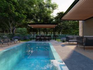 Neposredno okruženje vile stvoreno je za uživanje. Bilo da odaberete bazen, sunčalište, jednu od dvije terase s lounge prostorom ili mjesto u vanjskoj kuhinji, svaki trenutak bit će čista radost. S vanjske strane ove zone za uživanje nalazi se šuma i zelenilo koje ovu vilu skriva u svom malom raju.