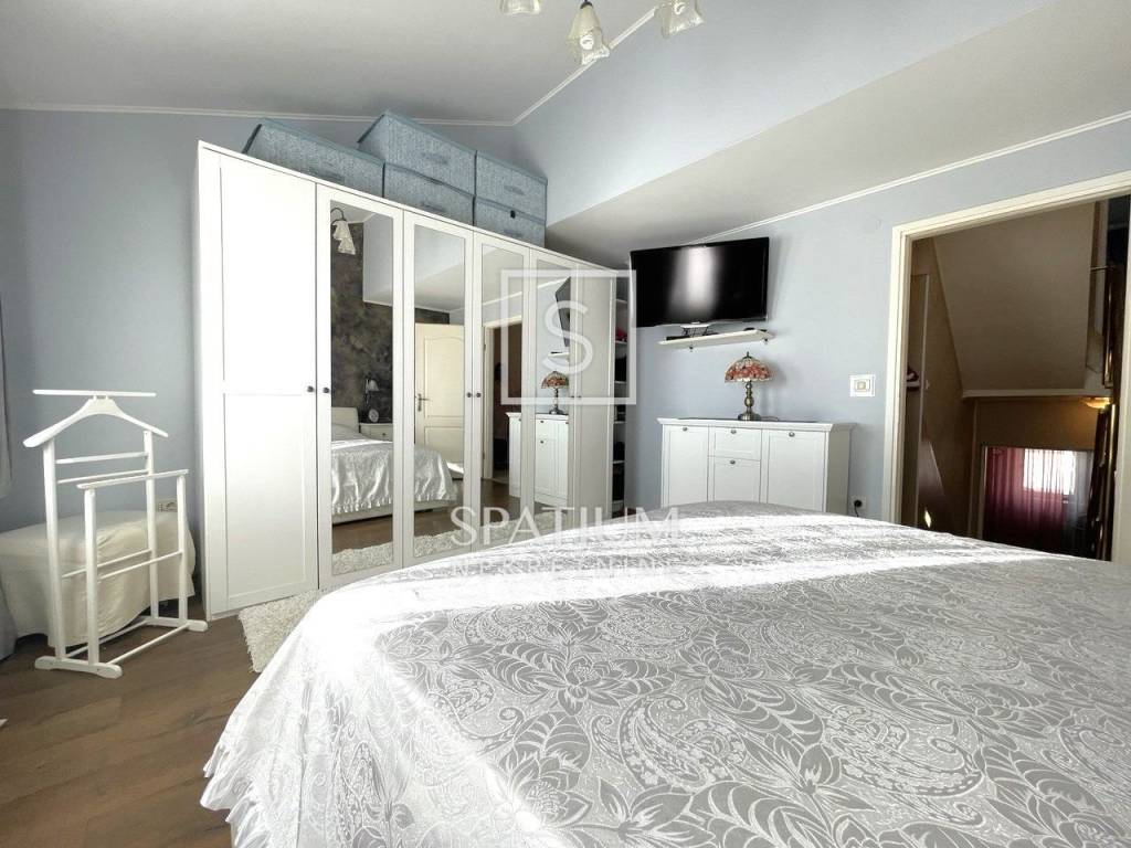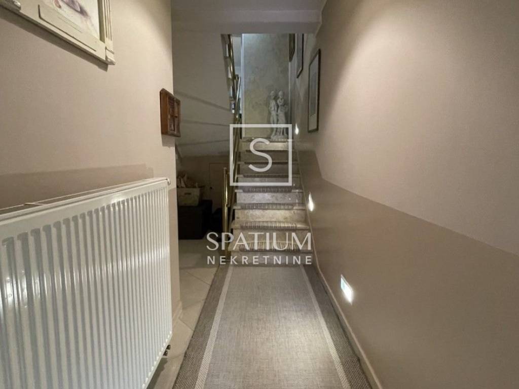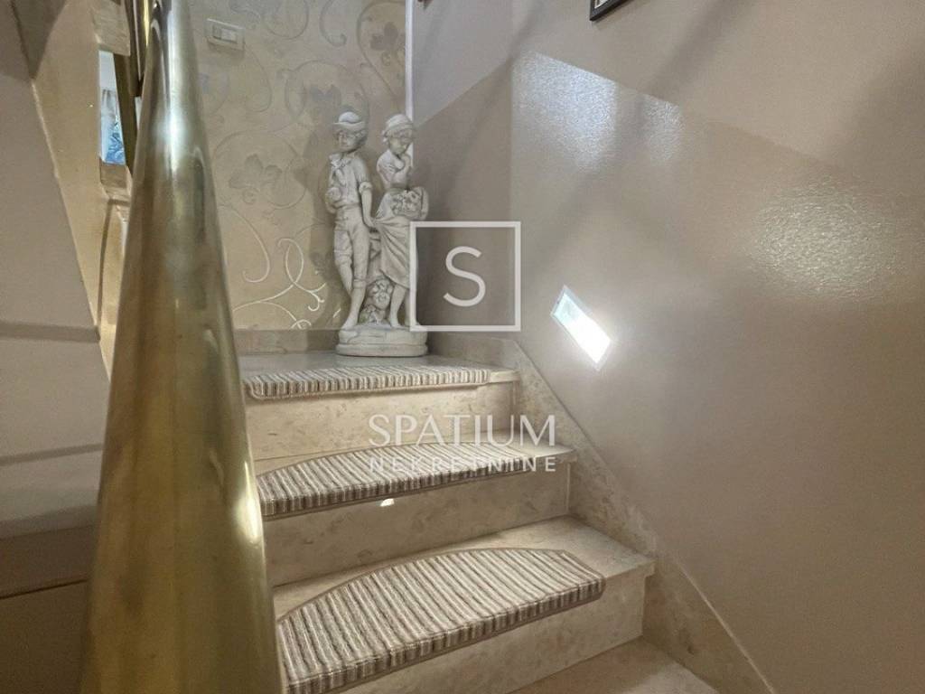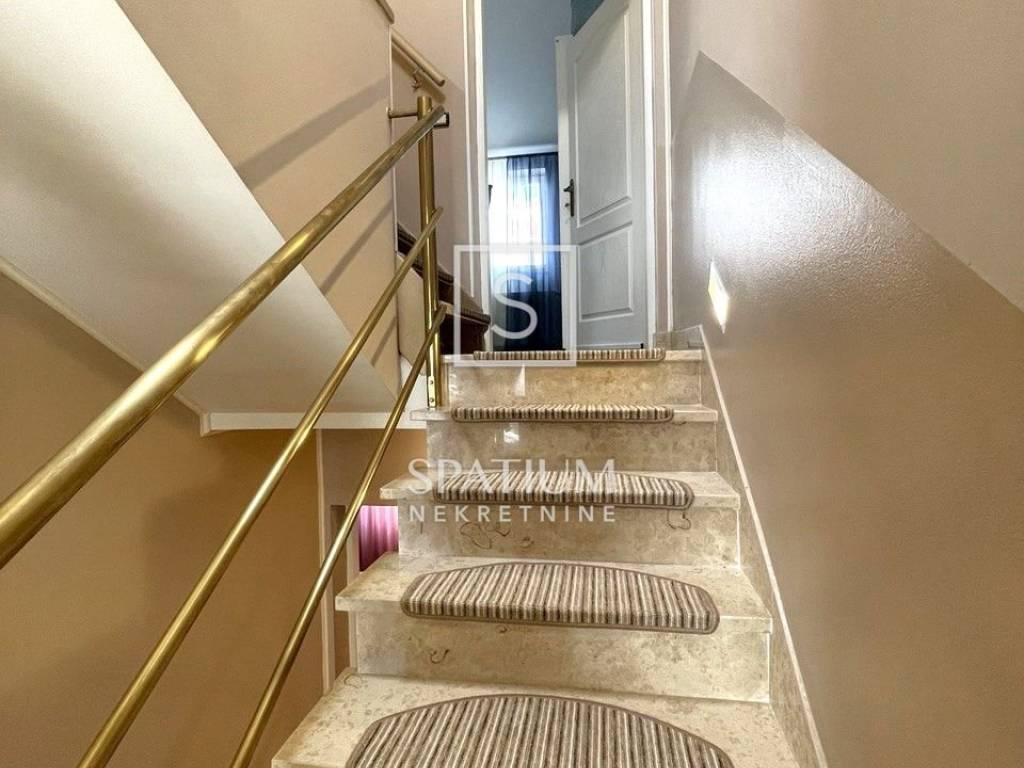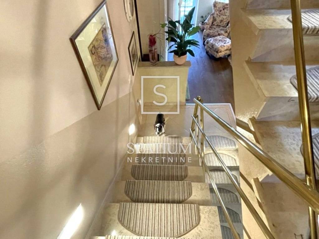 Stambena površina 154 m2 proteže se na pet polu - etaža. U prizemlju se nalazi garaža koja je povezana s unutrašnjosti kuće. Stepenice vode na prvu etažu gdje se smjestila kuhinja s blagovaonom koja ima izlaz na natkrivenu terasu koja je smještena na stražnjoj strani kuće, pružajući mir i privatnost. Na drugoj etaži nalazi se predivan dnevni boravak s balkonom i radna soba. Spavaće sobe nalaze se na trećoj, četvrtoj i petoj etaži. Sve etaže povezane su sa samo 7 stepenica.