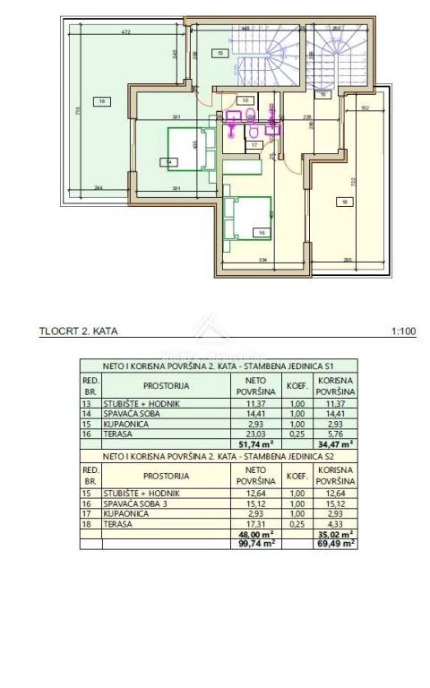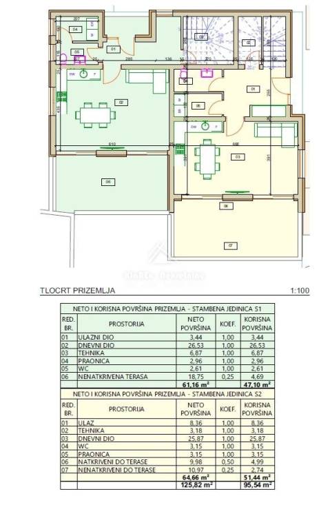 S1- dvojna kuća površine 163.37 m/2 s pripadajućim dvorištem i dva parkirna mjesta. Kuća je u završnoj fazi uređenja.
