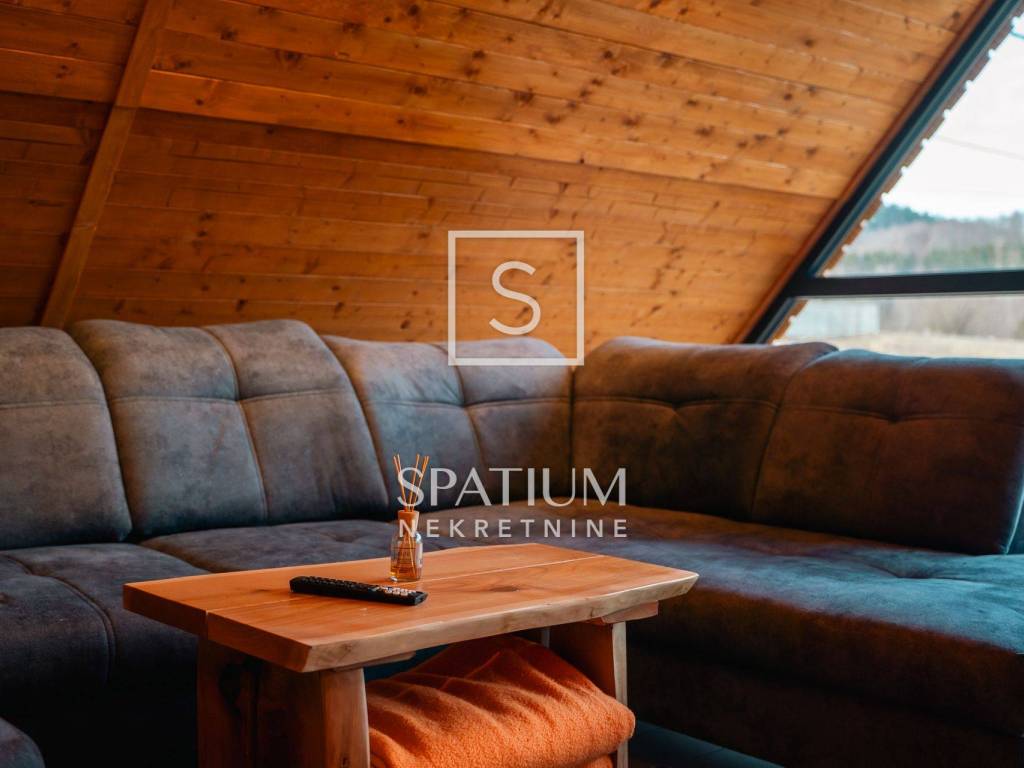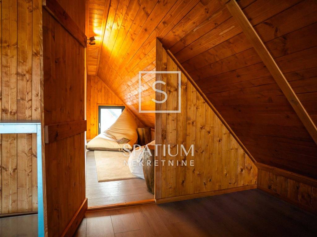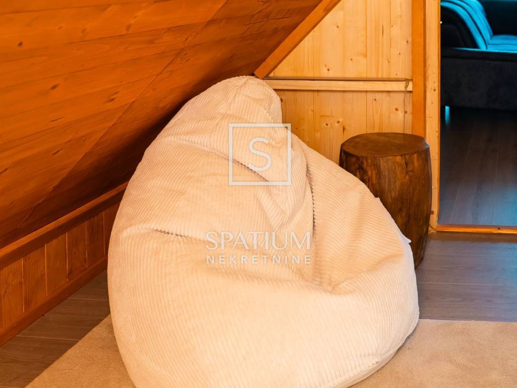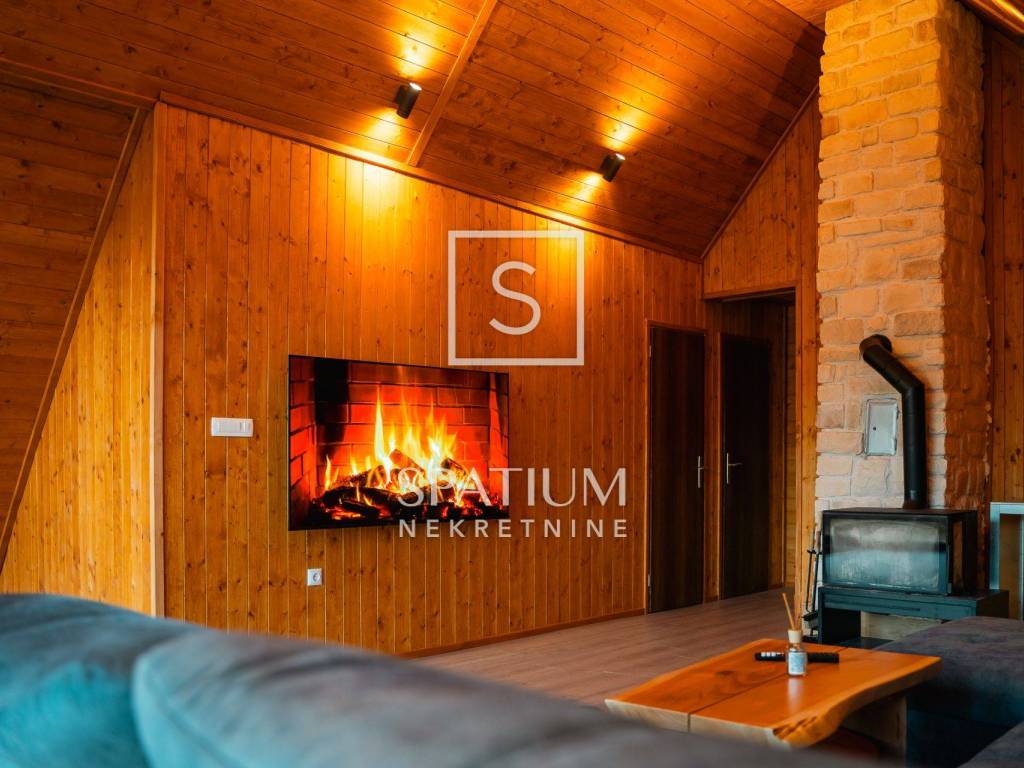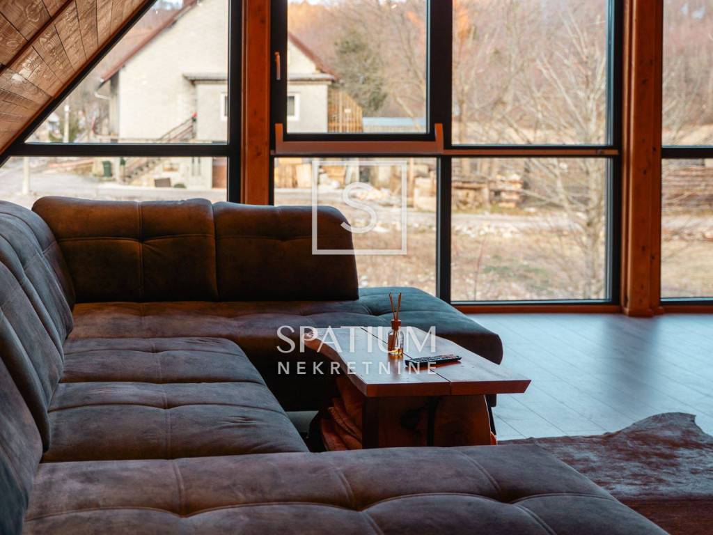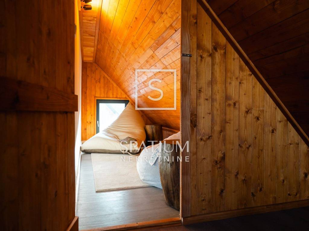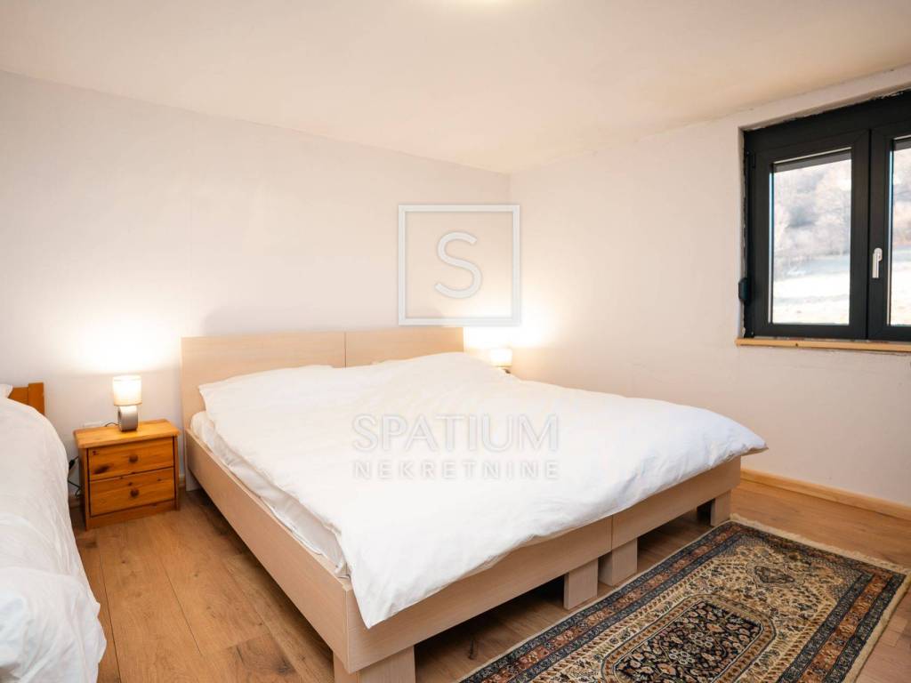 Kuća se ističe novom fasadom od drvenih oblica i modernom ALU stolarijom, što joj daje topao planinski karakter, ali i suvremenu funkcionalnost. U visokom potkrovlju, koje je u potpunosti renovirano i uređeno s puno pažnje i stila, nalazi se prostrani dnevni boravak, tri udobne spavaće sobe te ugodna čitaonica za opuštanje.