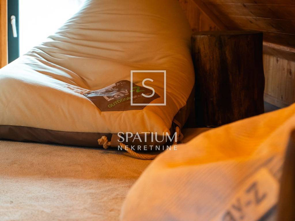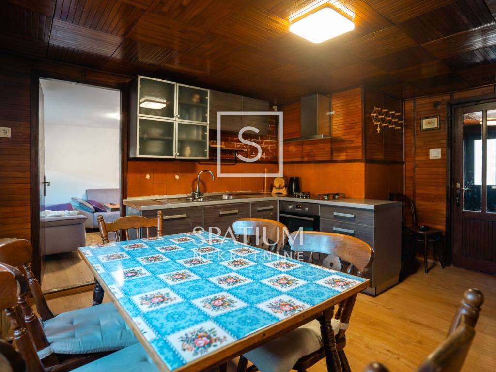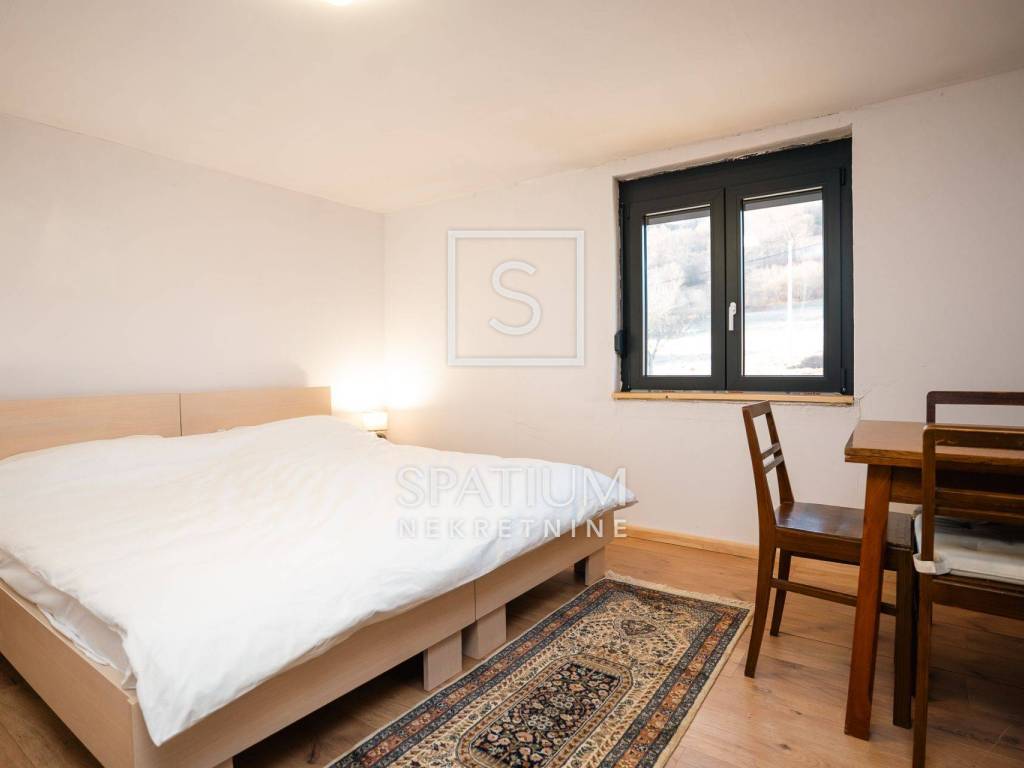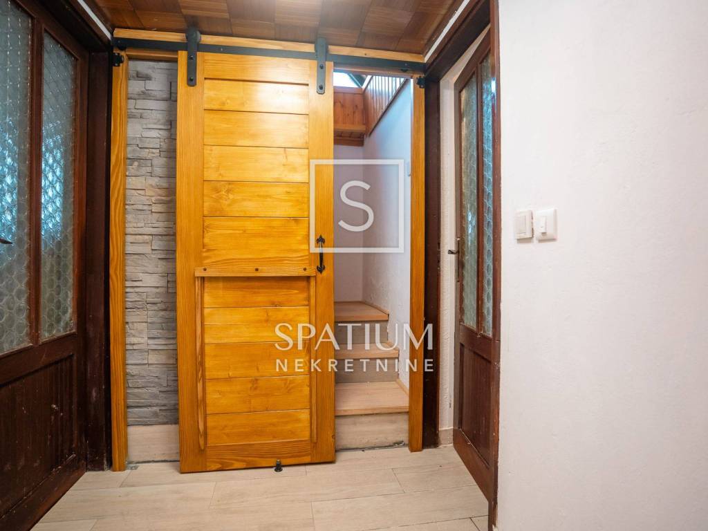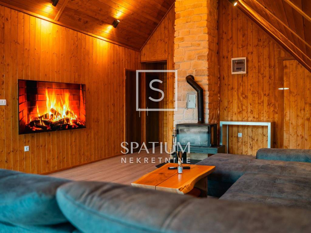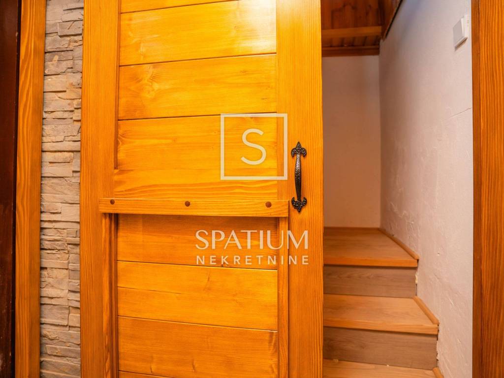 Kuća se ističe novom fasadom od drvenih oblica i modernom ALU stolarijom, što joj daje topao planinski karakter, ali i suvremenu funkcionalnost. U visokom potkrovlju, koje je u potpunosti renovirano i uređeno s puno pažnje i stila, nalazi se prostrani dnevni boravak, tri udobne spavaće sobe te ugodna čitaonica za opuštanje.