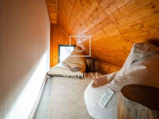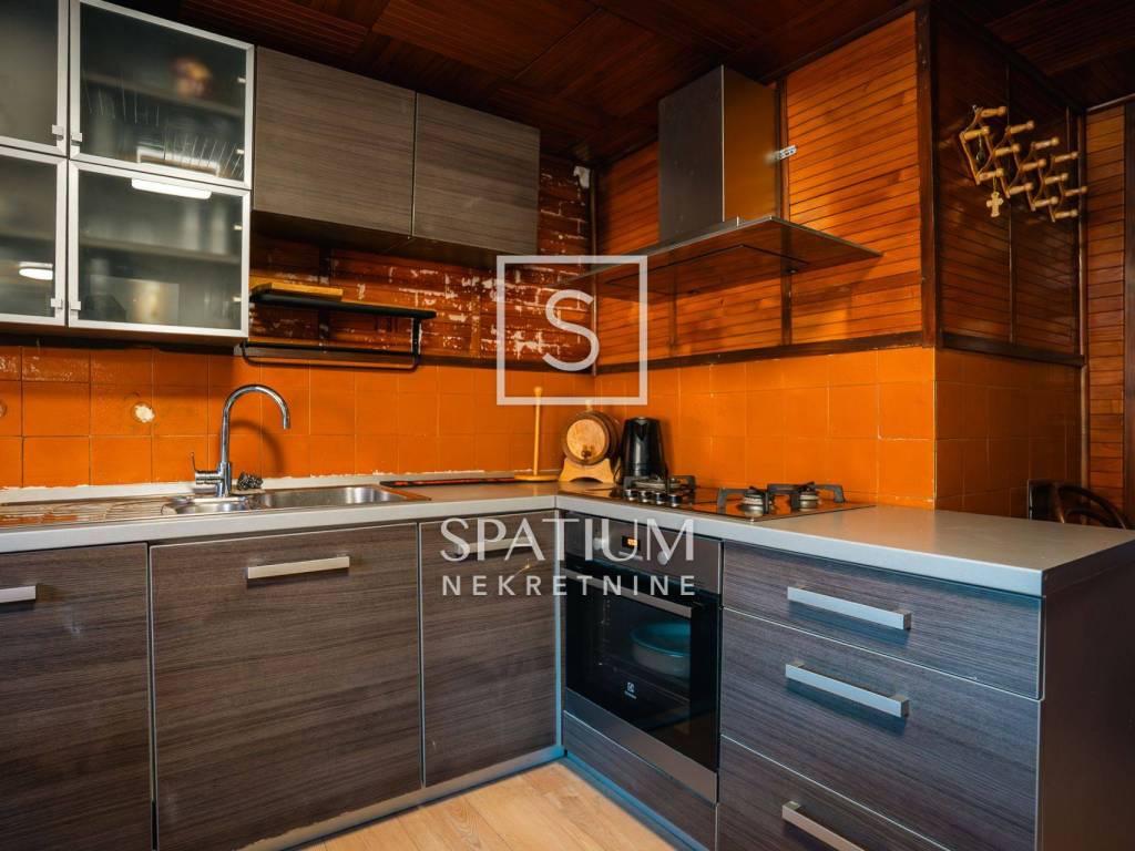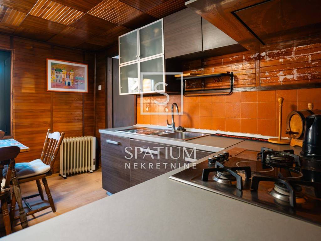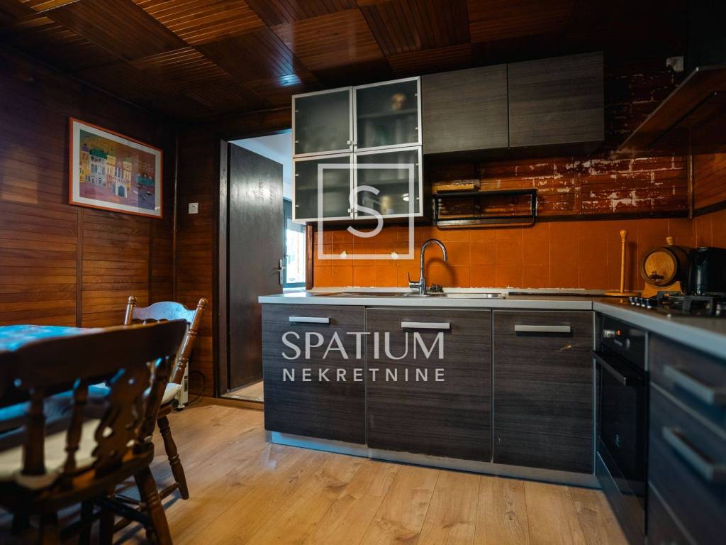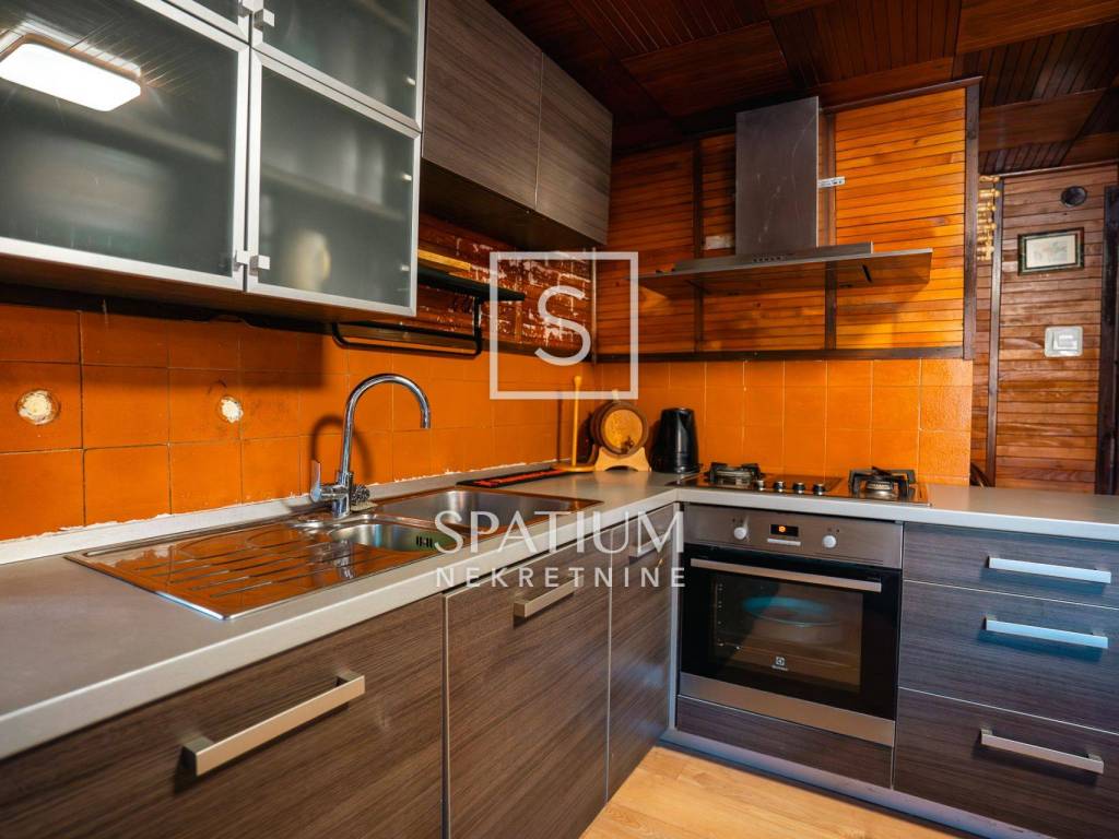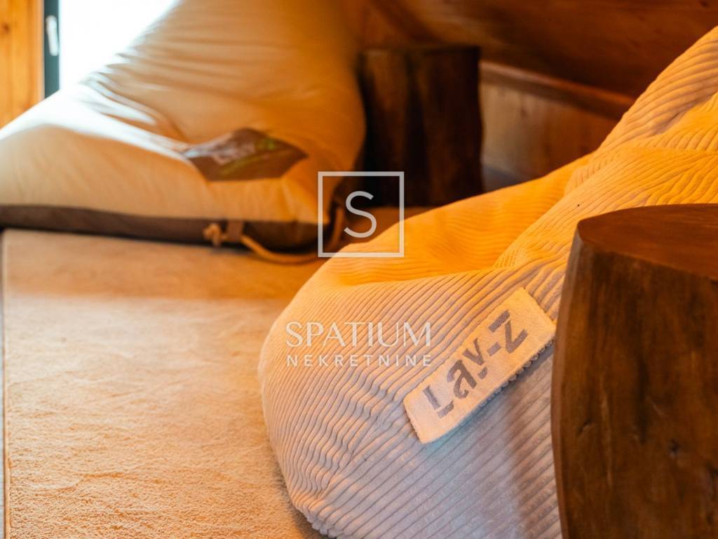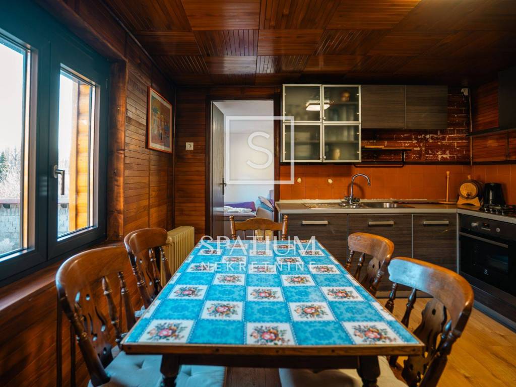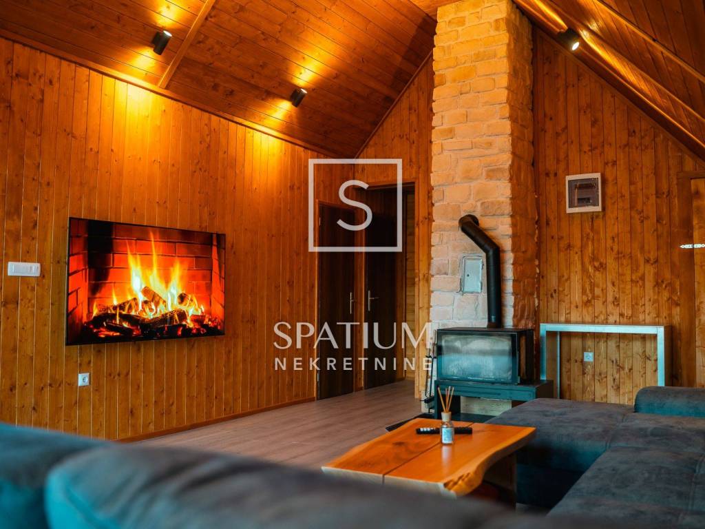 Kuća se ističe novom fasadom od drvenih oblica i modernom ALU stolarijom, što joj daje topao planinski karakter, ali i suvremenu funkcionalnost. U visokom potkrovlju, koje je u potpunosti renovirano i uređeno s puno pažnje i stila, nalazi se prostrani dnevni boravak, tri udobne spavaće sobe te ugodna čitaonica za opuštanje.