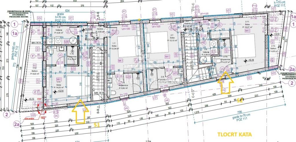Stambena jedinica S1- dvojna kuća/stan, neto površine 111.40 m/2 koja se sastoji od prizemlja u kojem se nalaze: ulazni pretprostor, kupaonica, spavaća soba, prostrani dnevni boravak, kuhinja s blagovaonicom, terasa površine 29.45 m/2, cca. 150 m² okućnice te jedno parkirno mjesto. Unutarnje stepenice vode do prvog kata koji se sastoji od: hodnika, praonice, dvije spavaće sobe s vlastitim kupaonicama i balkona površine 9,22 m².