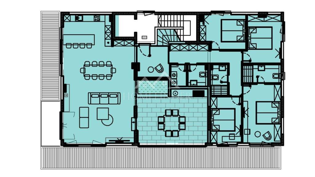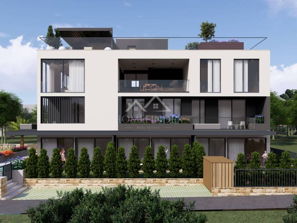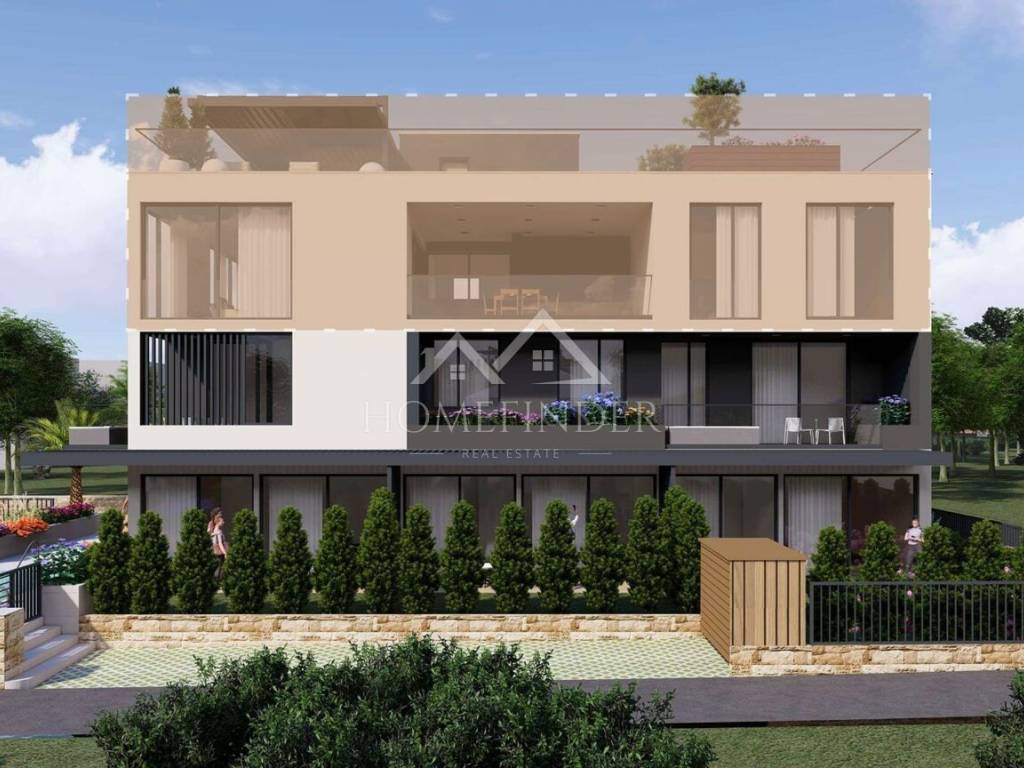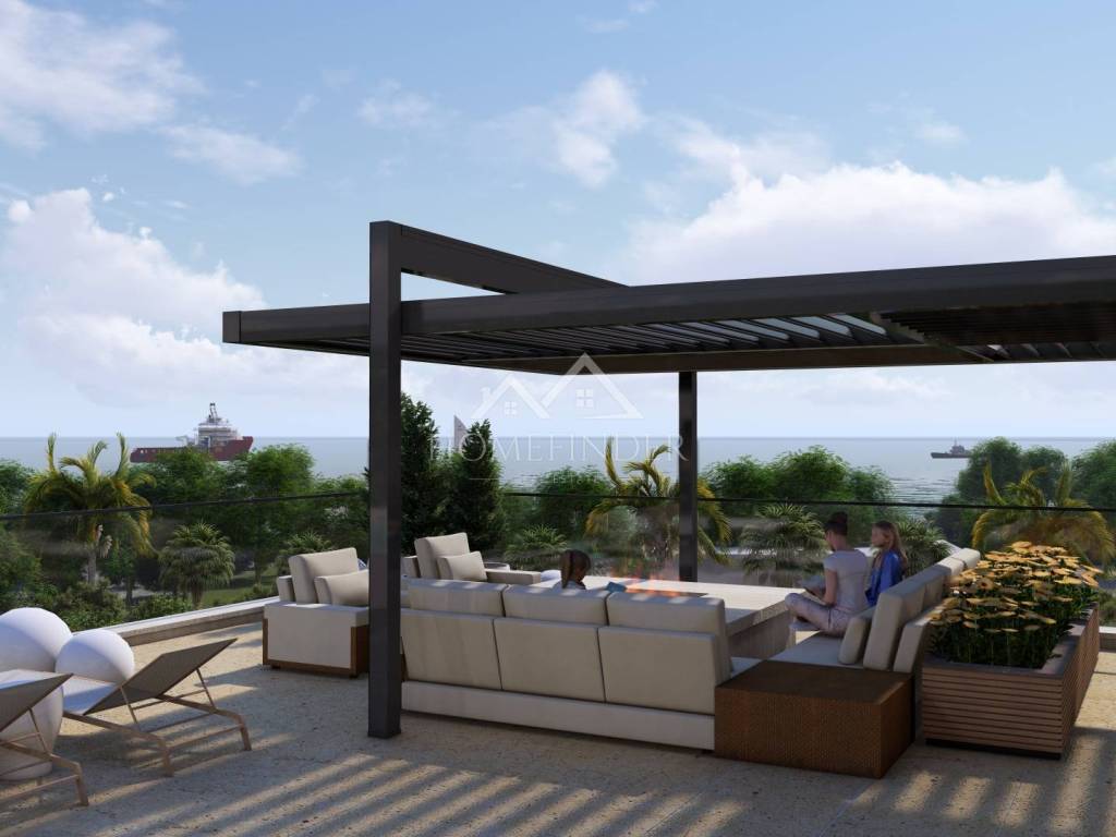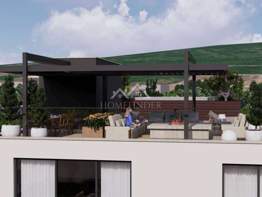 Gornja etaža je impresivna privatna krovna terasa koja pruža neometan panoramski pogled na more i uključuje privatni bazen. Ova terasa nudi brojne mogućnosti – od privatnog sunčališta, vanjskog prostora za objedovanje ili čak privatnog jacuzzija. Idealan prostor za uživanje u čarima mediteranskog načina života.