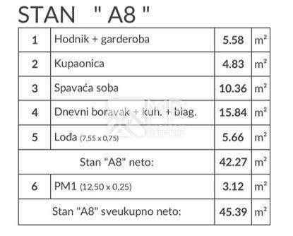 Na prodaju je stan oznake „A8“ koji se nalazi na 1.katu zgrade ukupne površine 45,39 m2.
