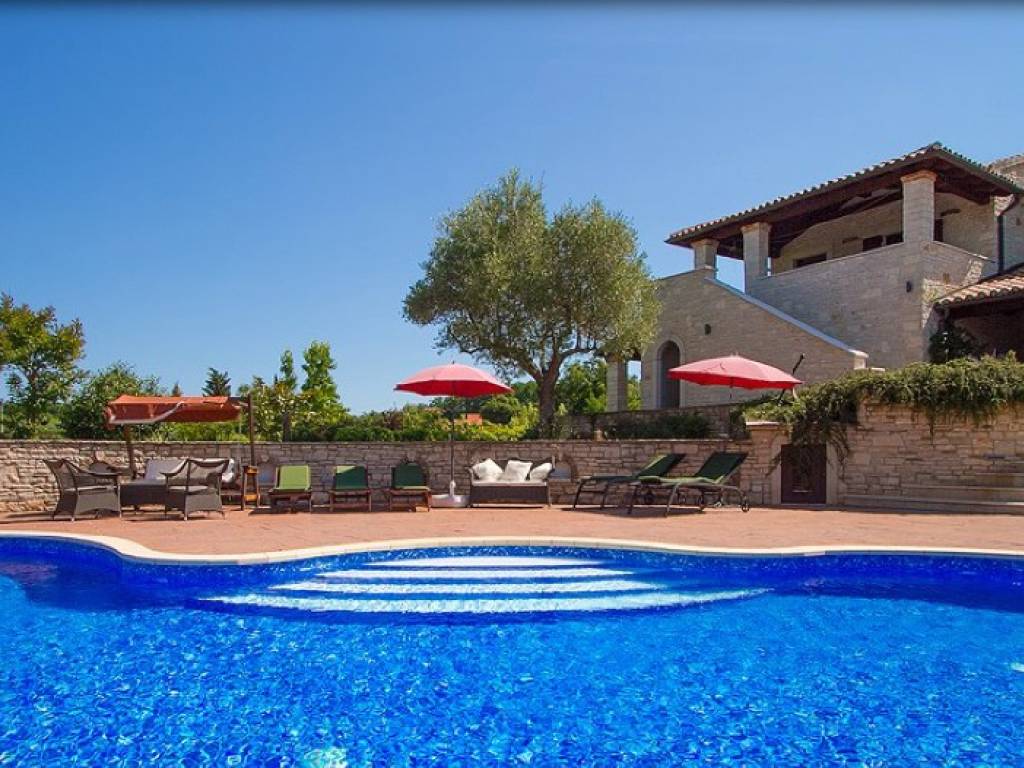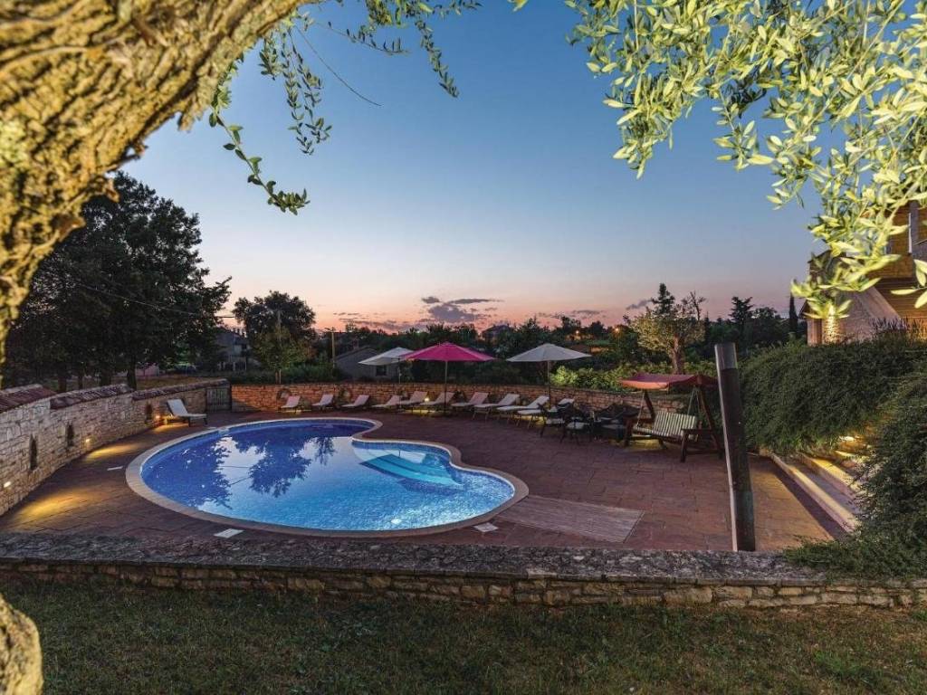 Svaka soba na katu ima svoje kupatilo, osim dvije koje dijele jedno kupatilo. Iz prizemlja se izlazi na veliku natkrivenu terasu s velikim drvenim stolom, natkrivenim prostorom s kaminom i roštiljem te frižiderom za piće. Stepeništem se spuštamo na plažu bazena.