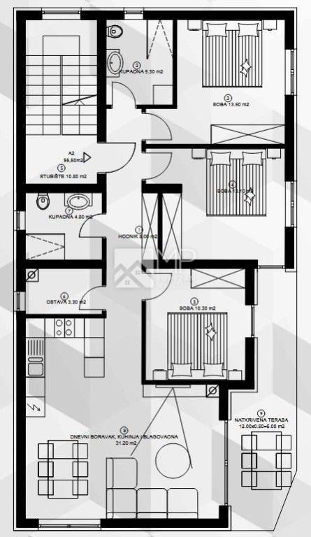 Navedeni stan oznake "A2" smjestio se na I. katu zgrade A, a sastoji se od ulaznog hodnika, open space DB-a sa kuhinjom i blagovaonicom, tri spavaće sobe ( od kojih jedna spavaća ima vlastitu kupaonicu ), kupaonice, ostave i natkrivene terase. Stanu pripada i spremište koje se nalazi u prizemlju zgrade, te 2 parkirna mjesta.
